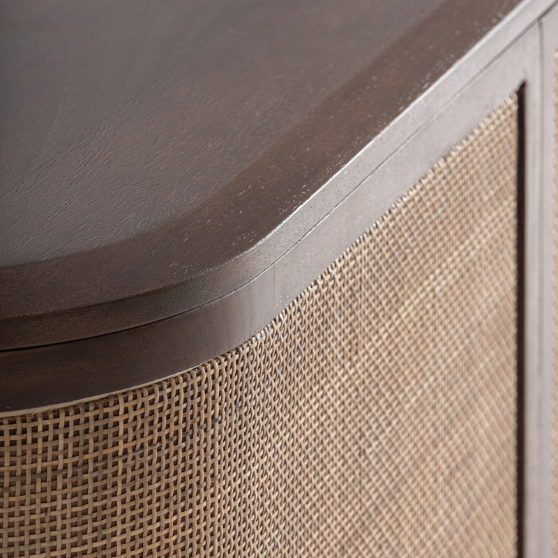 Aparador Gondorf de estilo Nordico Fabricado en Madera de Mango en Color Marron Combinado Con Ratan en Color Arena. Producto desmontable.
