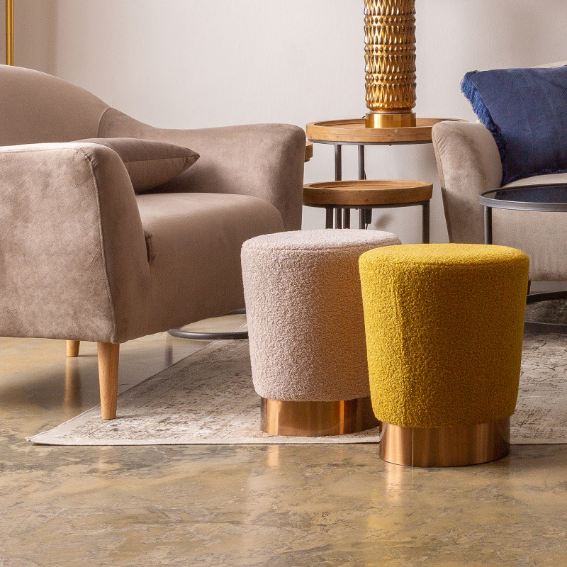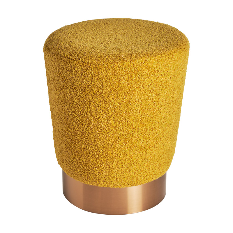 Reposapies bats, en color mostaza, de estilo shabby chic. Fabricado en poliester, combinado con acero y algodon boucle. Espuma.