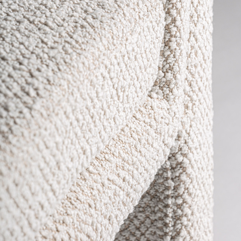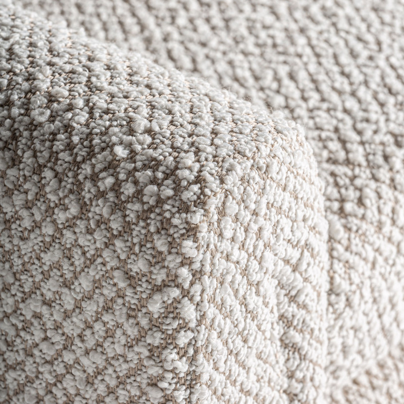 Banco rectangular izegem de estilo art deco, fabricado en algodon boucle en color blanco roto con acabado liso, combinado con acrilico y madera de caucho. Producto desenfundable.