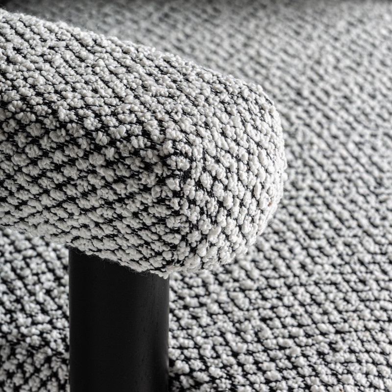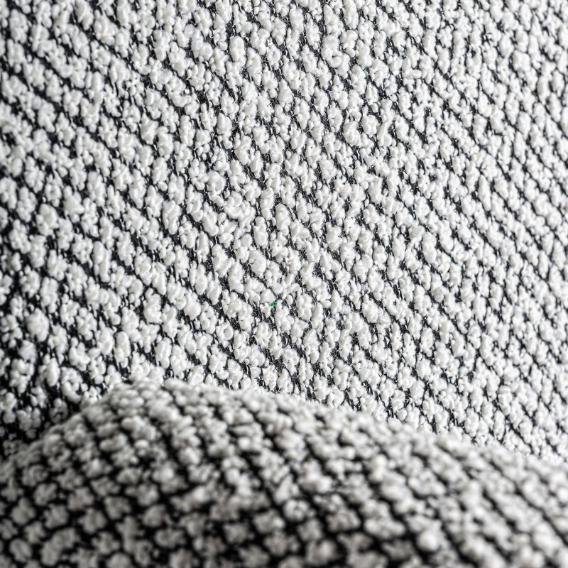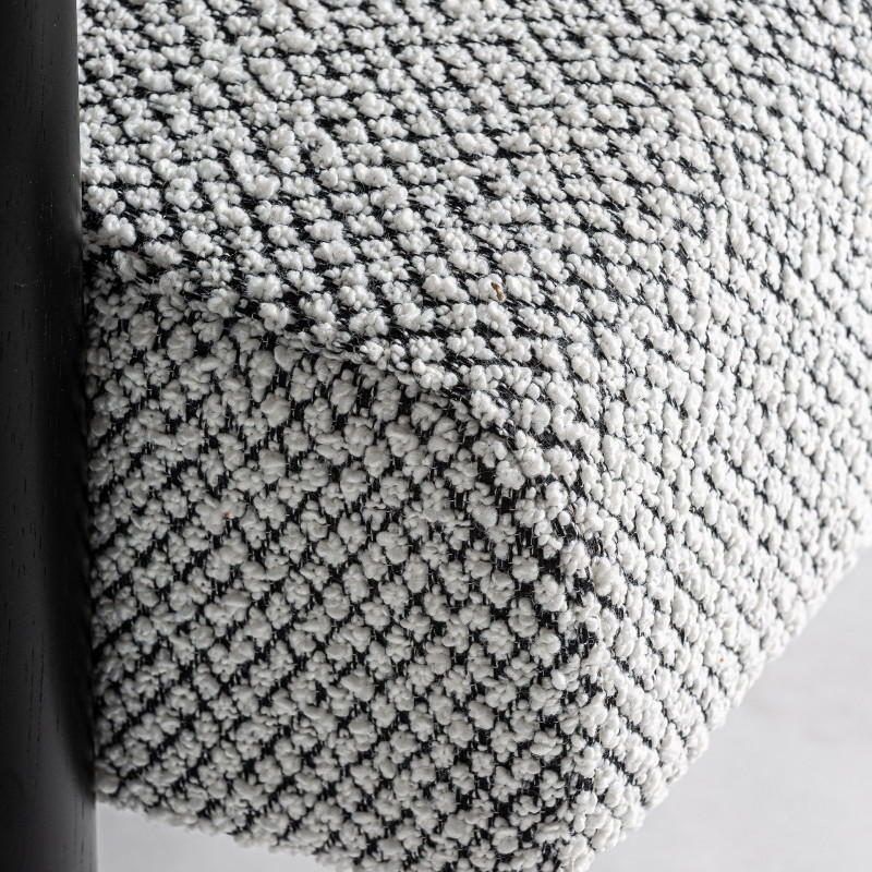 Sillon cuadrado liester de estilo art deco, fabricado en algodon boucle en color gris con acabado liso, combinado con acrilico en color negro y madera de caucho.