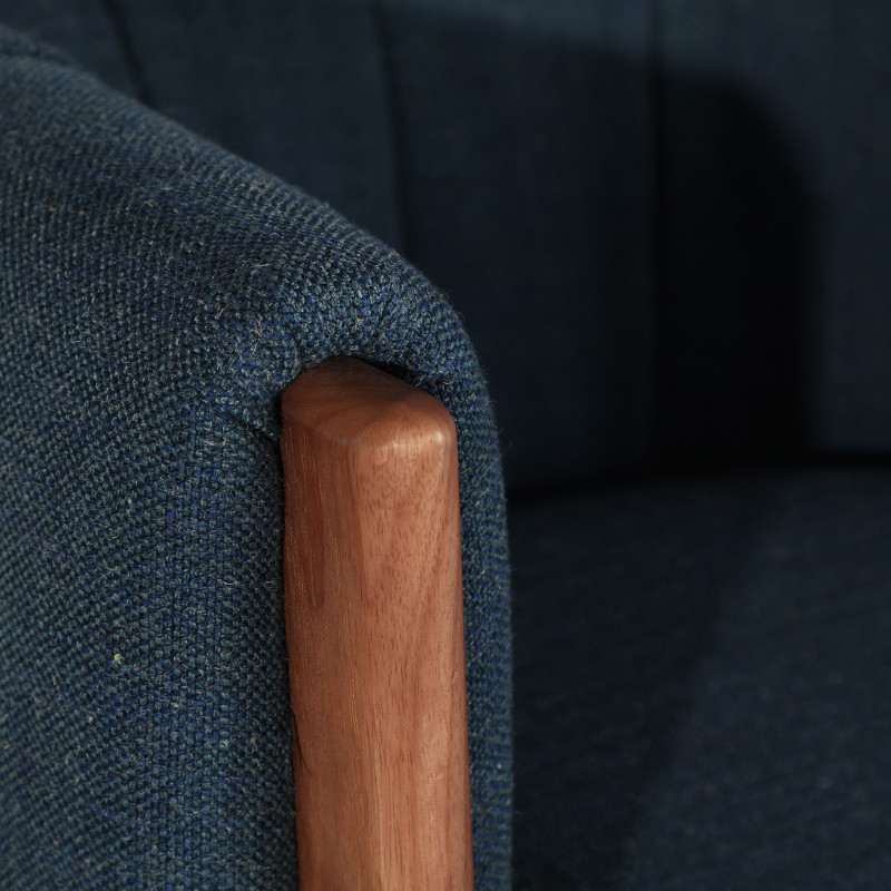 Sillon fabricado en madera de pino en color marron combinado con poliester en color azul con acabado jaspeado y espuma. Tapizado jaspeado en azul verde y gris. .
