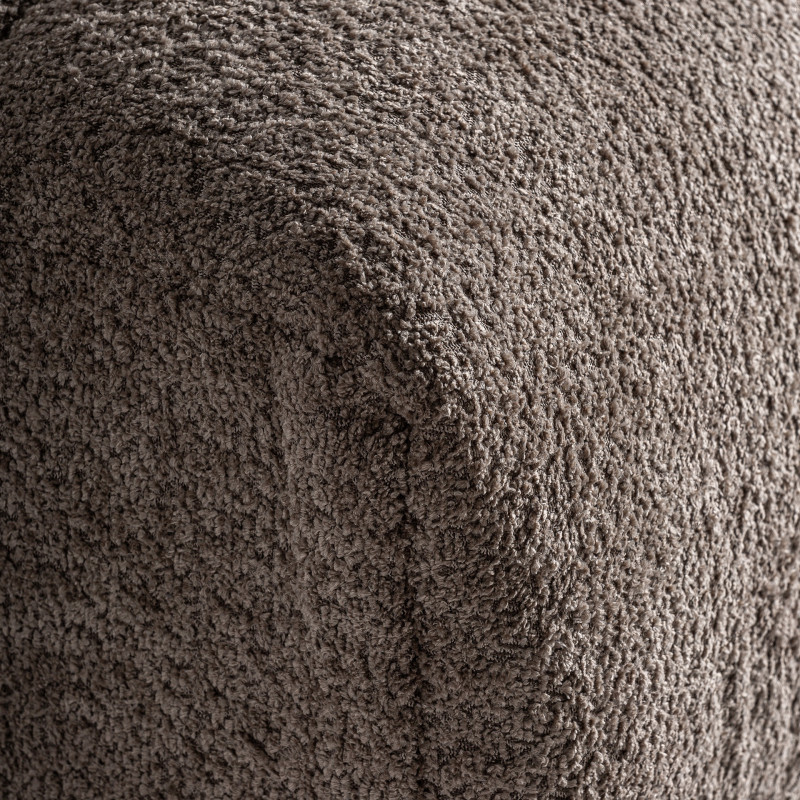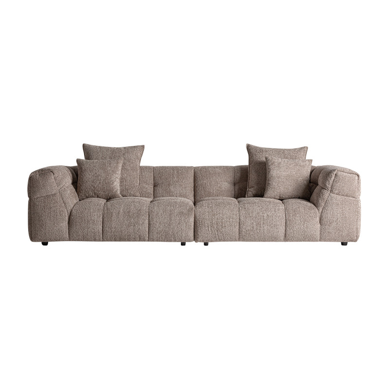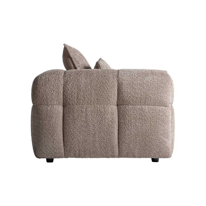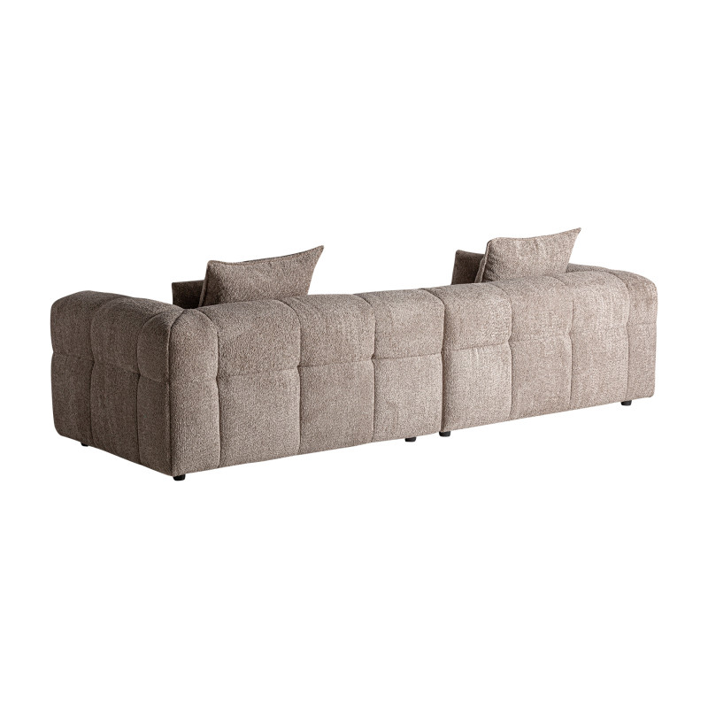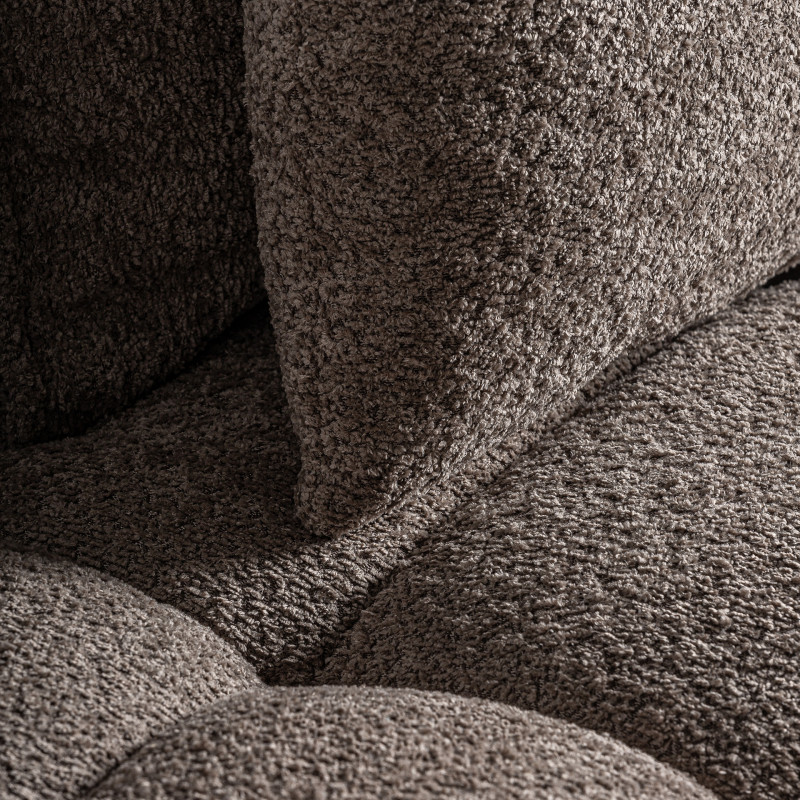 Sofa Barlin de estilo contemporaneo fabricado en madera de alerce en color marron combinado con poliester en color marron y hierro en color negro. Cojines rellenos de pluma de oca mixta. .