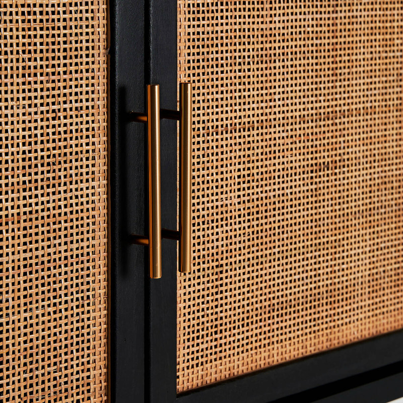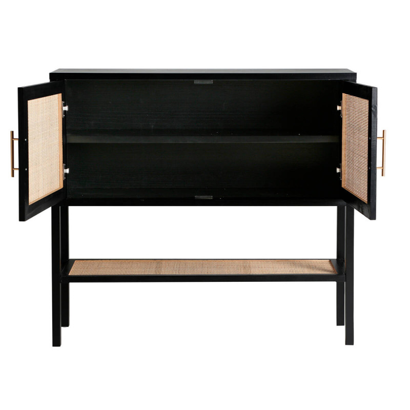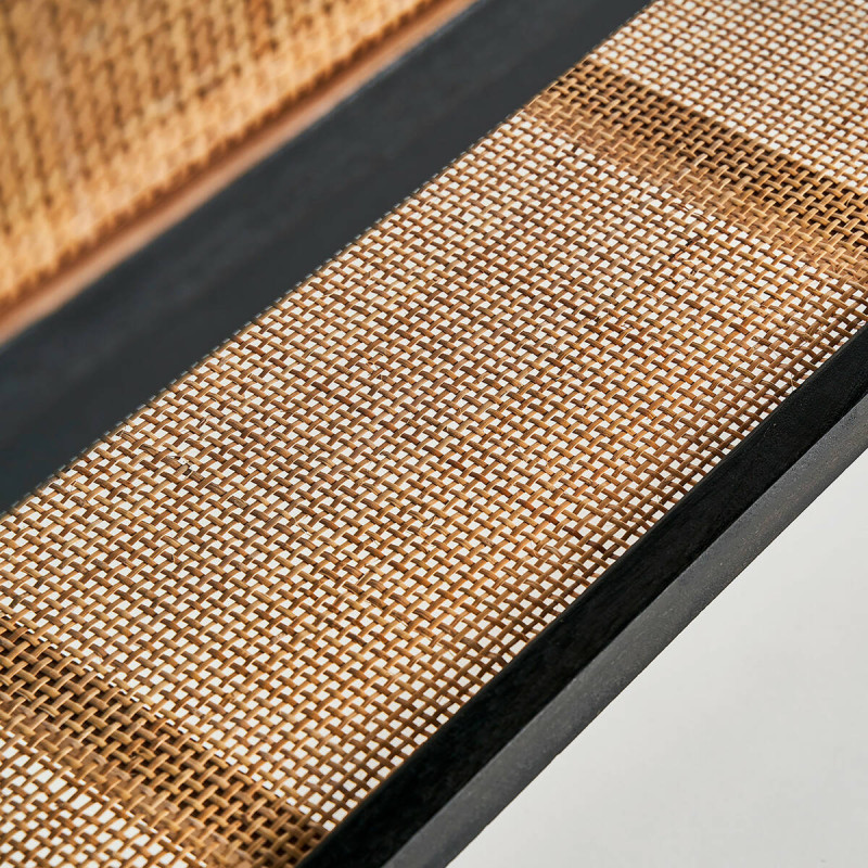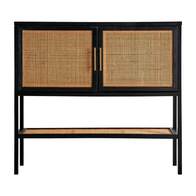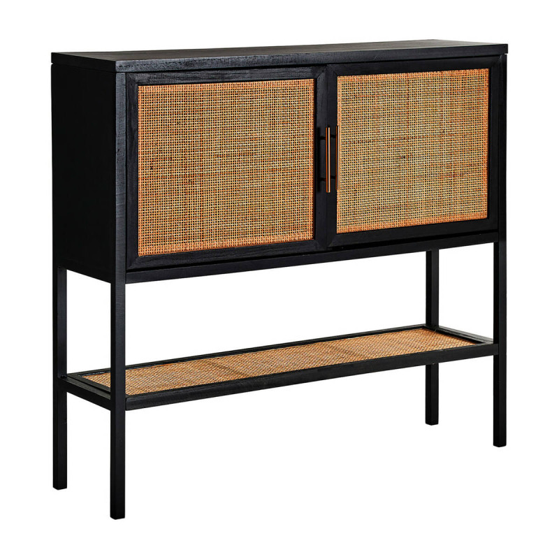 Consola beilen, en color negro/natural, de estilo nordico. Fabricado en madera de pino, combinado con madera dm y ratan. Producto desmontable.