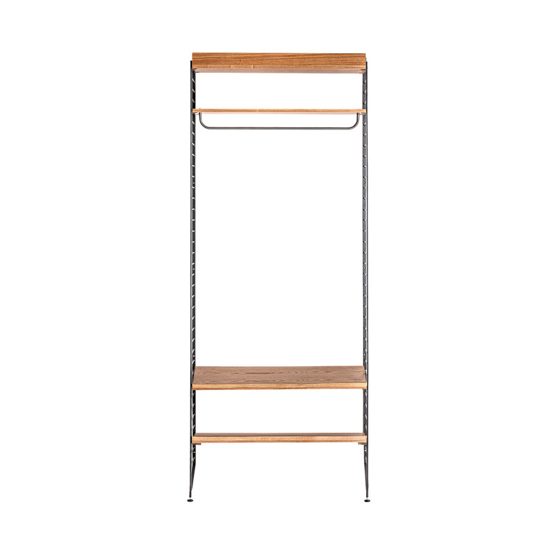 Perchero gualta, en color natural, de estilo industrial. Fabricado en madera de abeto, combinado con hierro y madera dm. Producto desmontable.