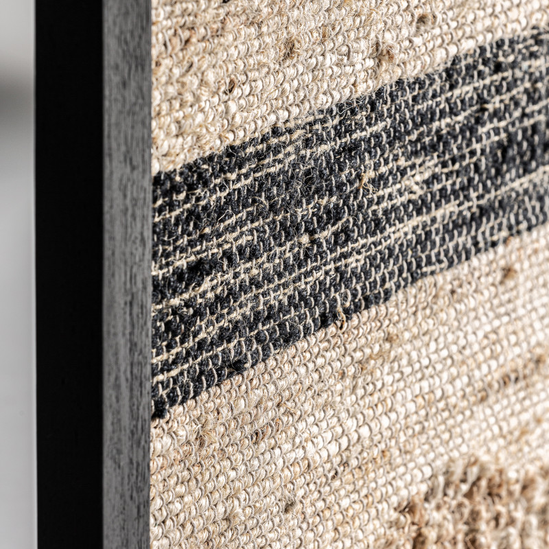 Cuadro cesc, en color tonos oscuros artesanal, de estilo contemporaneo. Fabricado en madera de mango, combinado con yute y algodon.