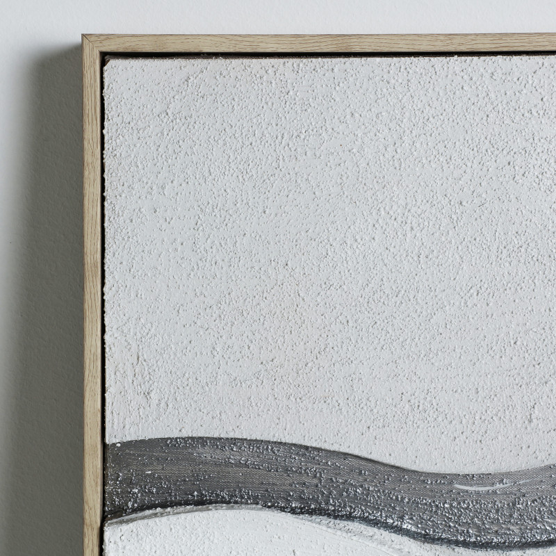 Cuadro rectangular maddox de estilo contemporaneo, fabricado en lienzo en color blanco/gris con acabado artesanal, combinado con poliestireno en color arena y madera de pino.