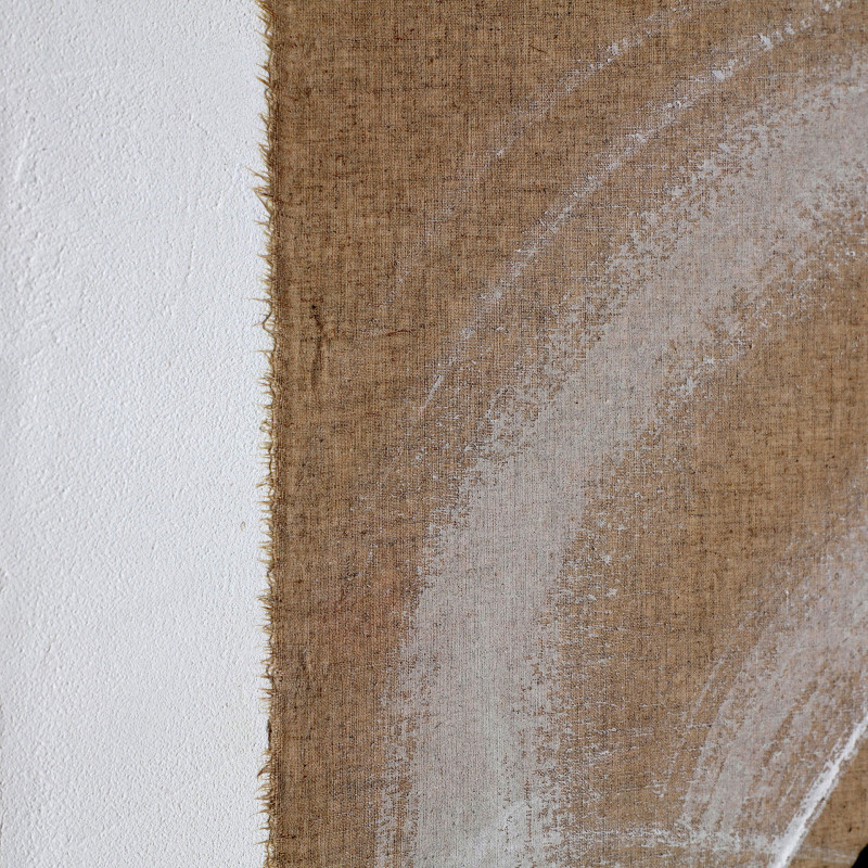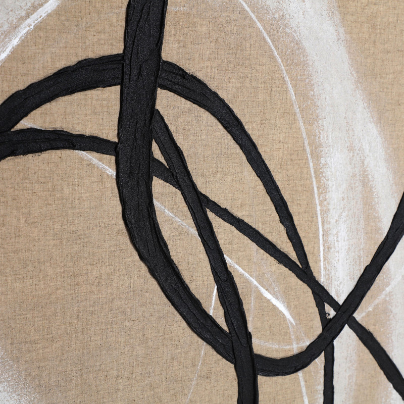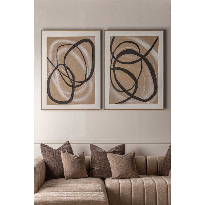Cuadro rectangular gabrielle de estilo contemporaneo, fabricado en lienzo en color beige con acabado artesanal, combinado con madera de pino en color marron claro.