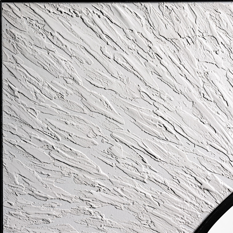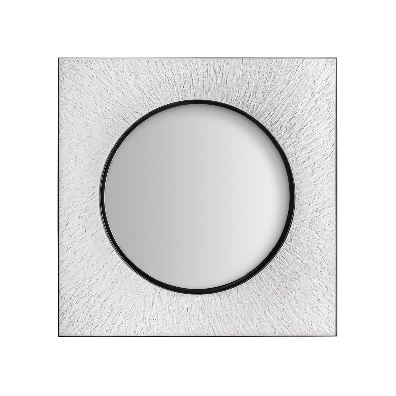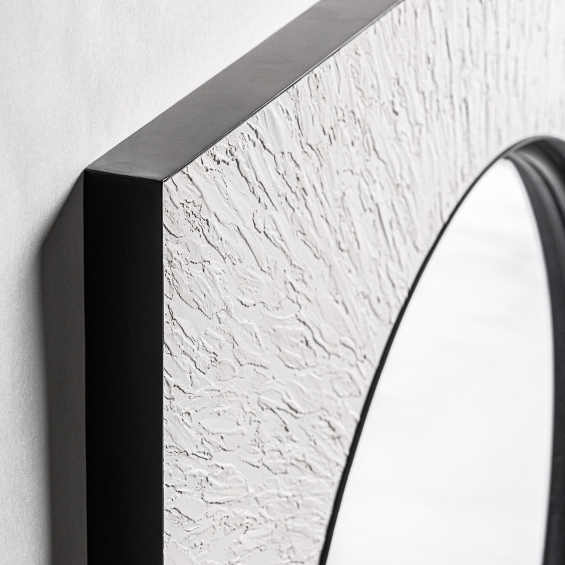 Espejo hakim de estilo art deco fabricado en madera dm en color blanco con acabado rugoso combinado con hierro en color negro y espejo.