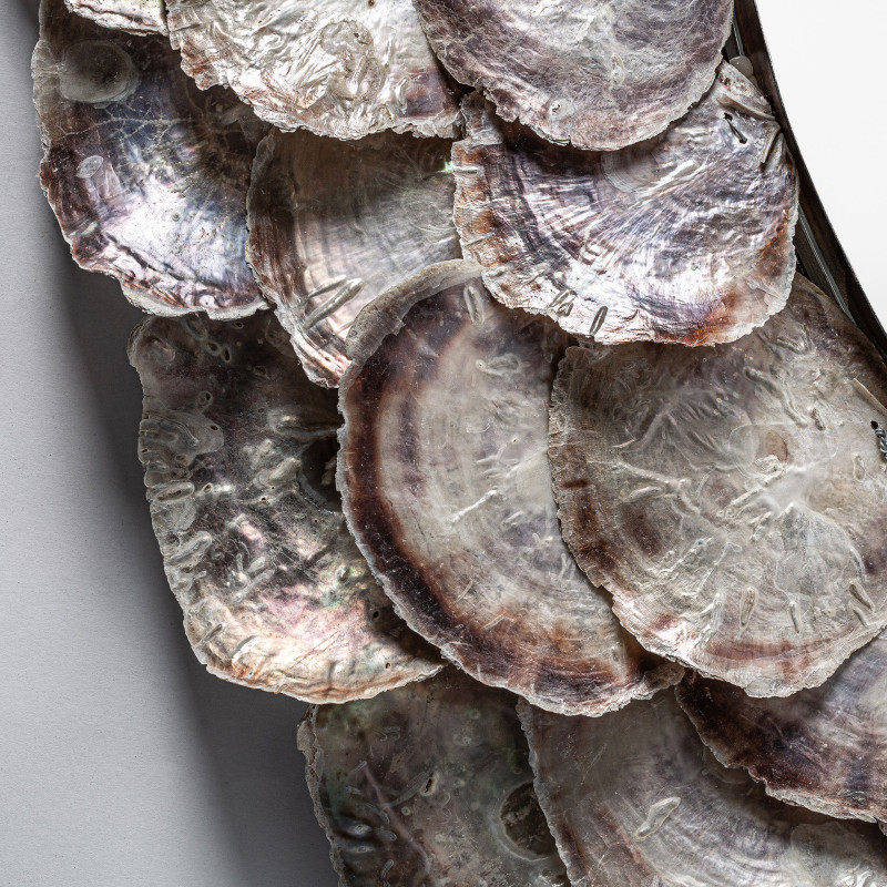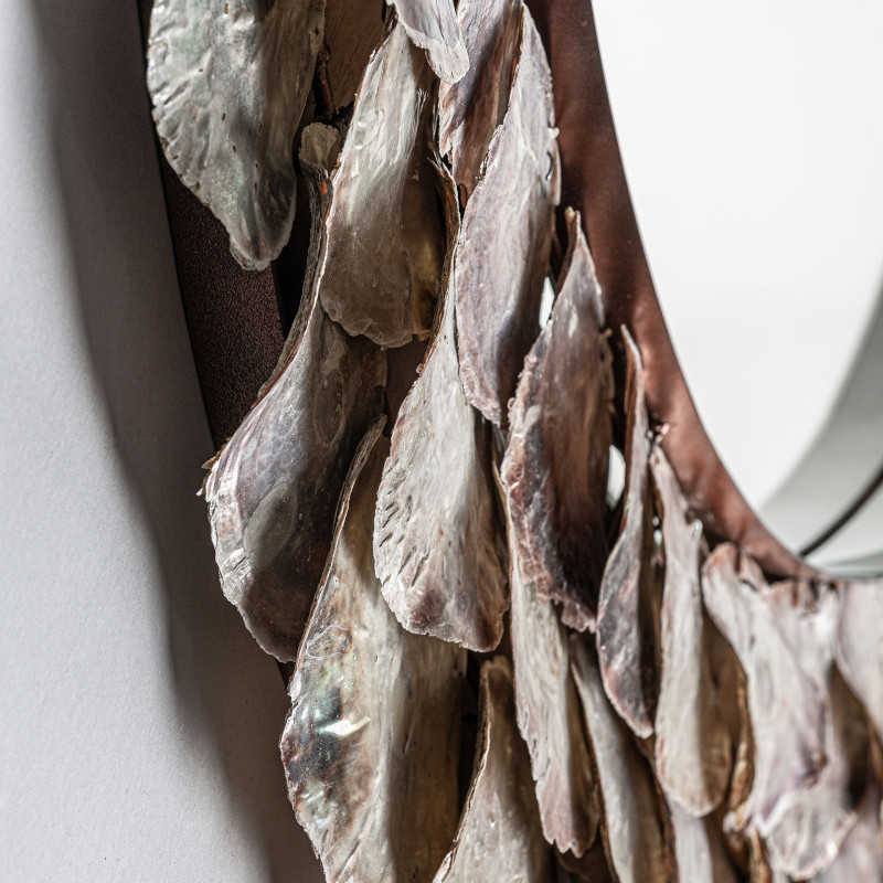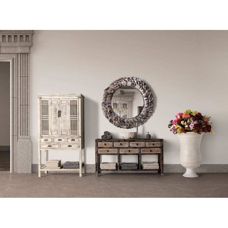 Espejo redondo inga de estilo nordico fabricado en acero en color marfil combinado con concha y espejo. Concha de ostra.