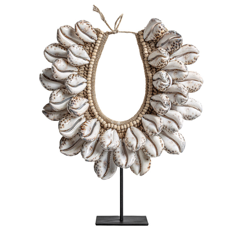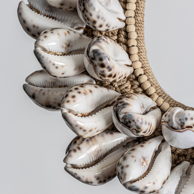Figura conchas de estilo etnico fabricado en resina en color blanco combinado con hierro en color marron y concha. Fibra natural. Producto desmontable.
