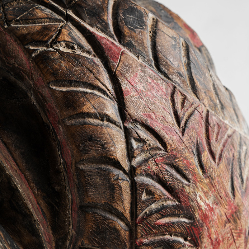 Figura decorativa de estilo etnico fabricado en madera en color tonos en marron con acabado envejecido combinado con hierro en color negro.