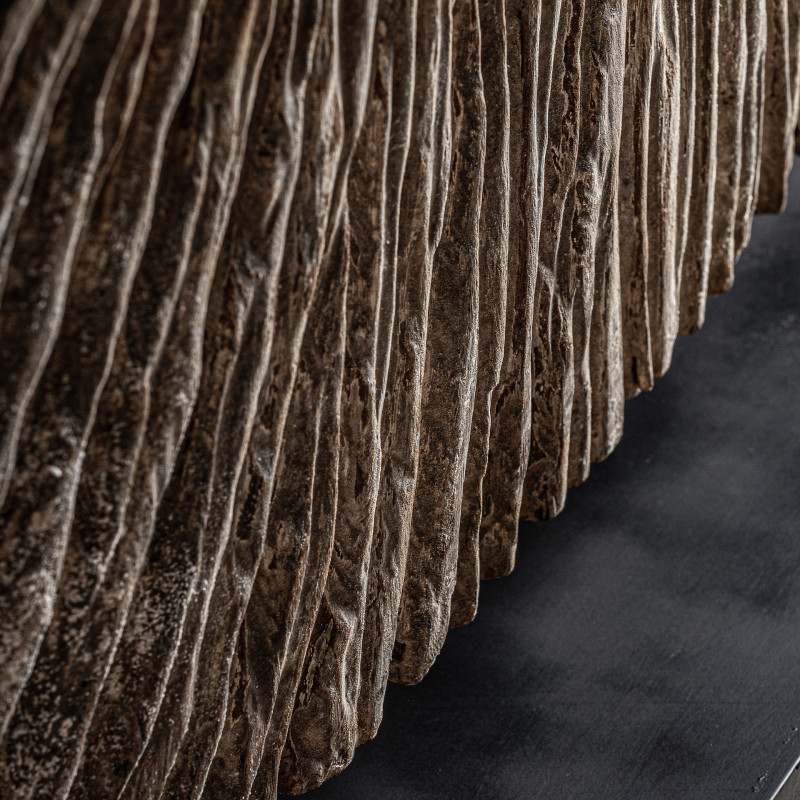 Escultura Pie de estilo etnico Fabricado en Madera Suar en Color Marron Con Acabado envejecido Combinado Con Hierro en Color Negro.