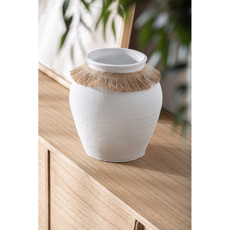 Jarron enit, en color blanco, de estilo boho. Fabricado en ceramica.