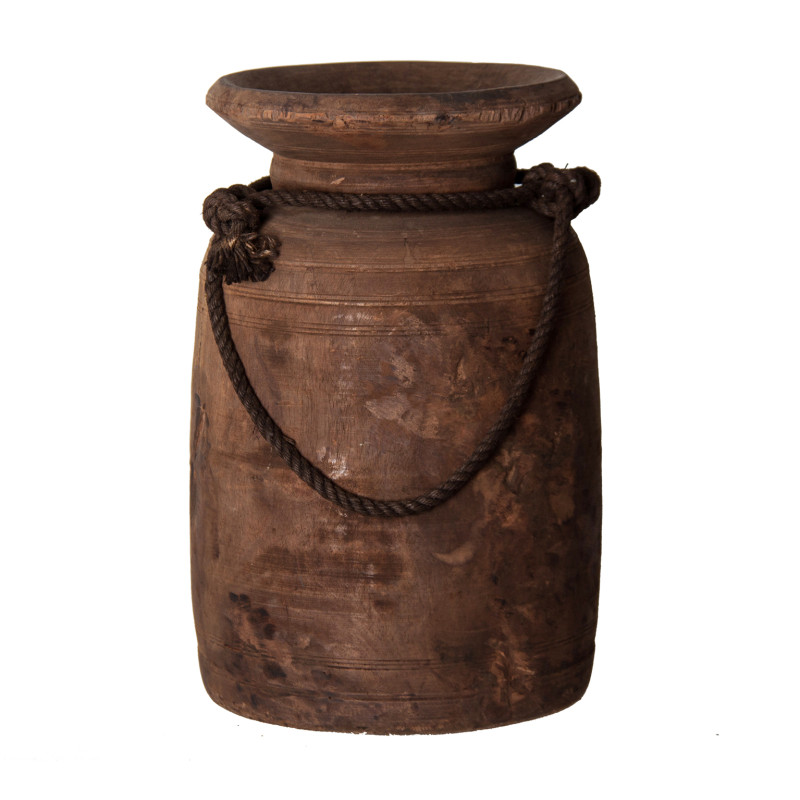 Jarron zaulle de estilo etnico fabricado en madera de teka reciclada en color marron con acabado envejecido.