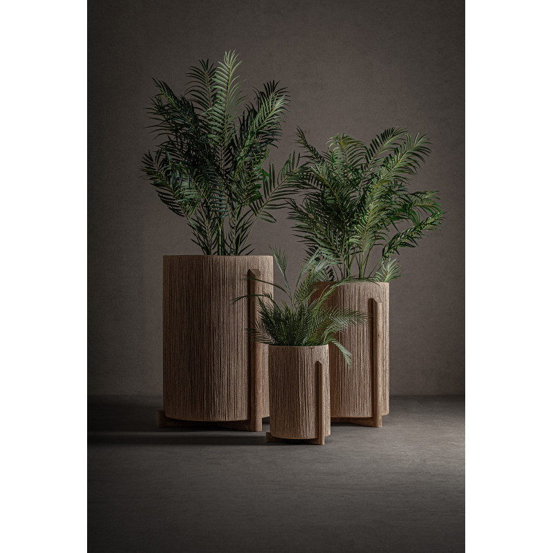 Macetero Jacquard de estilo Contemporaneo. Fabricado en Madera de Mango en Color Marron Combinado Con Rafia en Color Marron Claro.