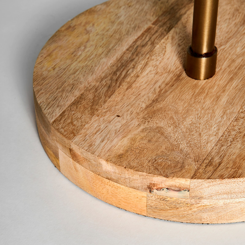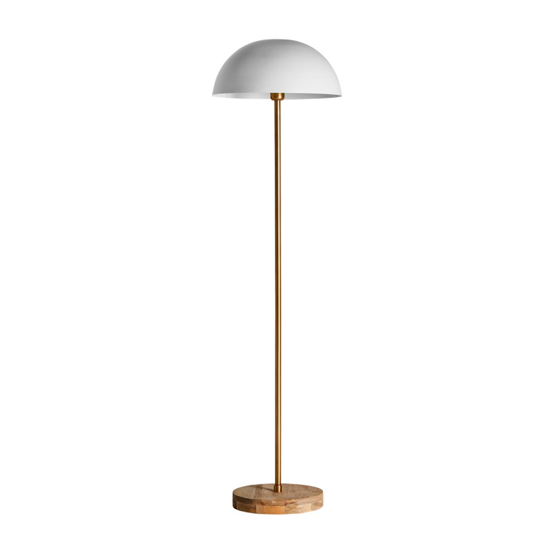 Lampara de pie kalina, en color blanco/oro, de estilo art deco. Fabricado en hierro, combinado con madera de mango. Producto desmontable.
