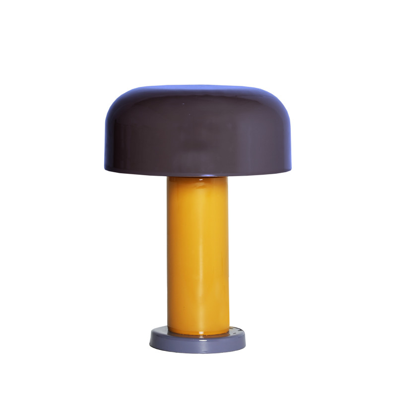 Lampara de sobremesa Albate de estilo moderno, fabricado en vidrio en color morado en color crema y hierro en color mostaza.