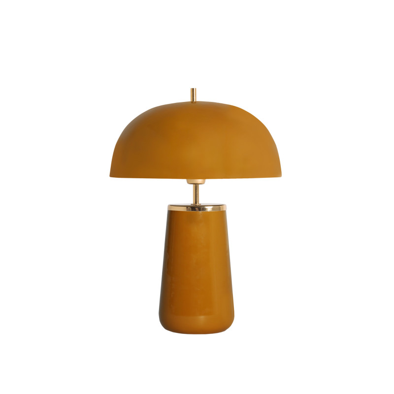 Lampara de sobremesa Arosa de estilo moderno, fabricado en hierro en color mostaza con acabado brillo en color oro.