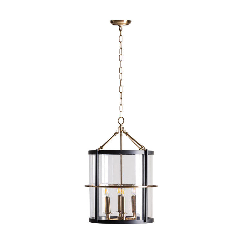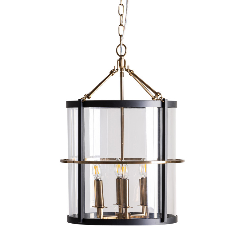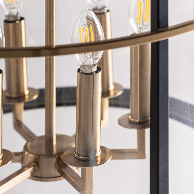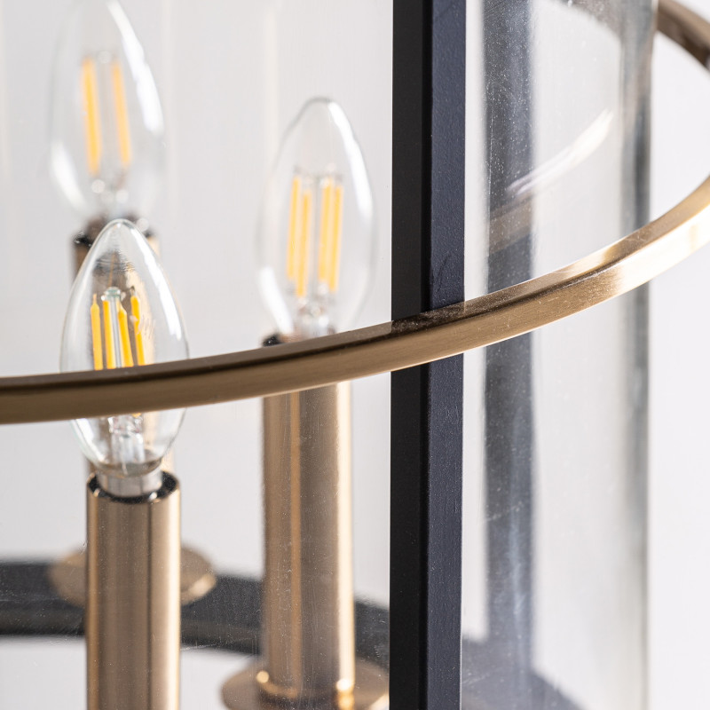 Lampara de colgar en color negro oro de estilo art deco. Fabricado en hierro combinado con metacrilato. Producto desmontable.