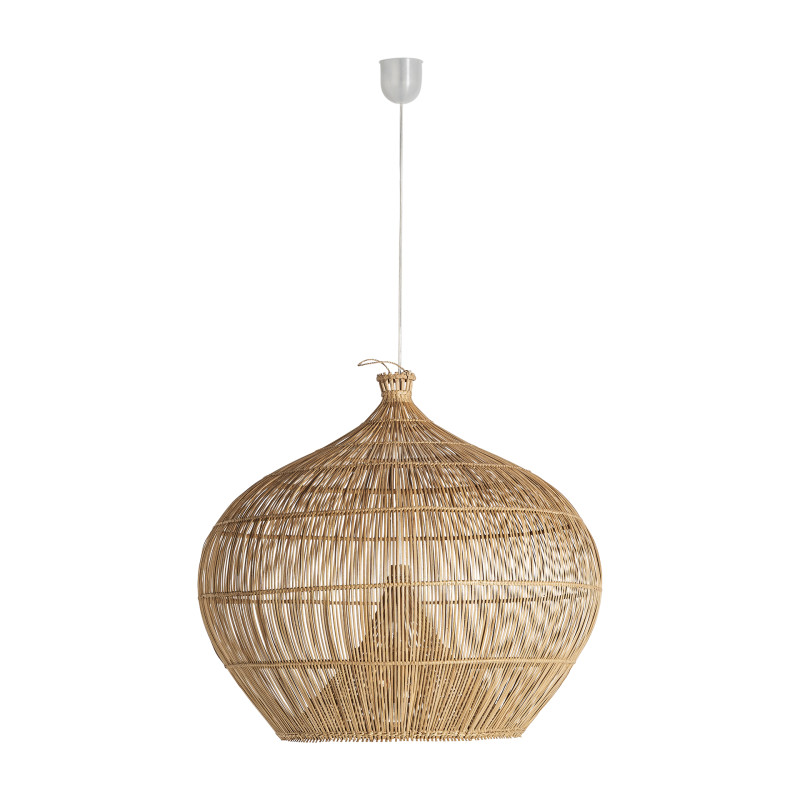 Lampara de colgar de estilo boho fabricado en bambu en color marron claro.