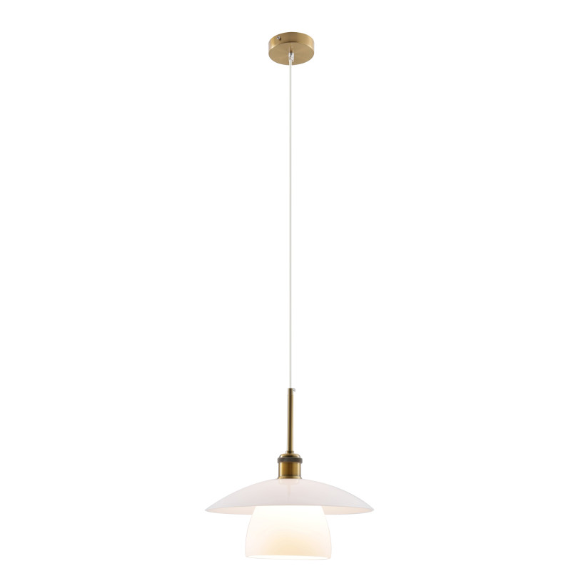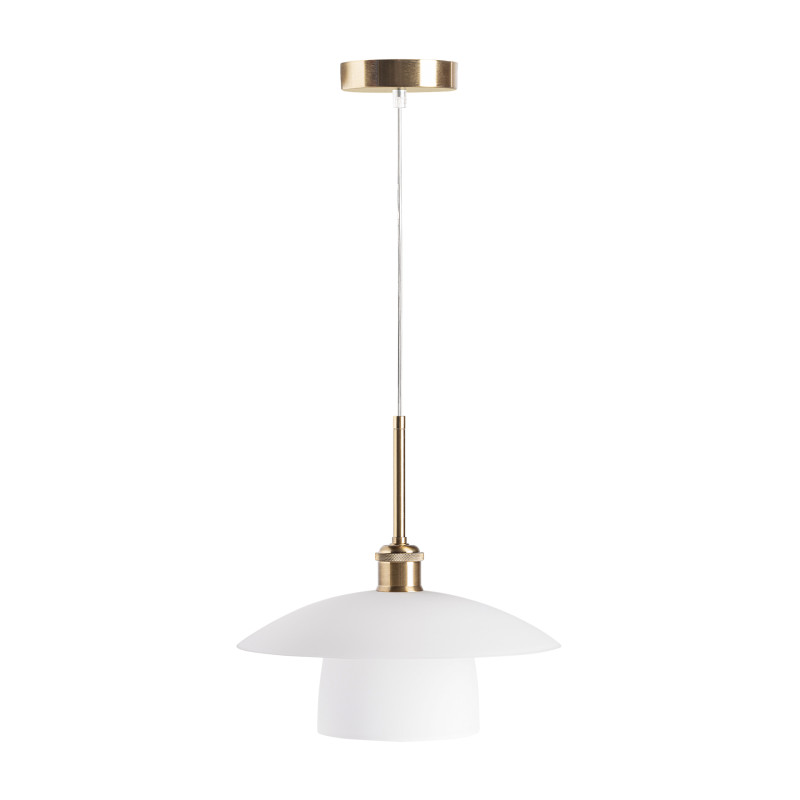 Lampara de colgar de estilo art deco fabricado en cristal en color blanco en color oro. Producto desmontable.