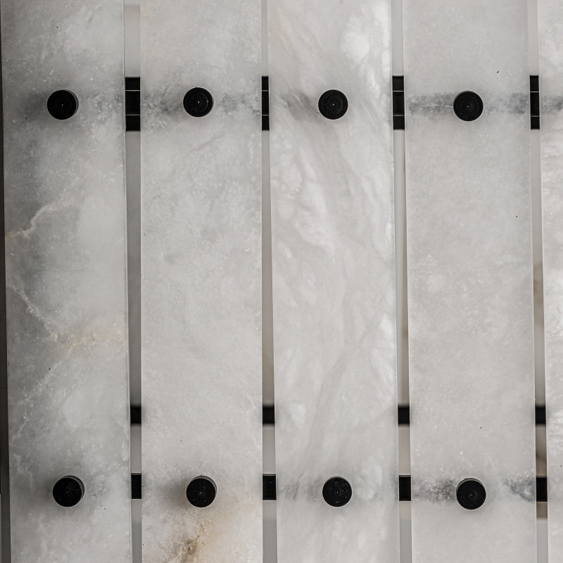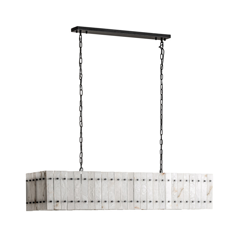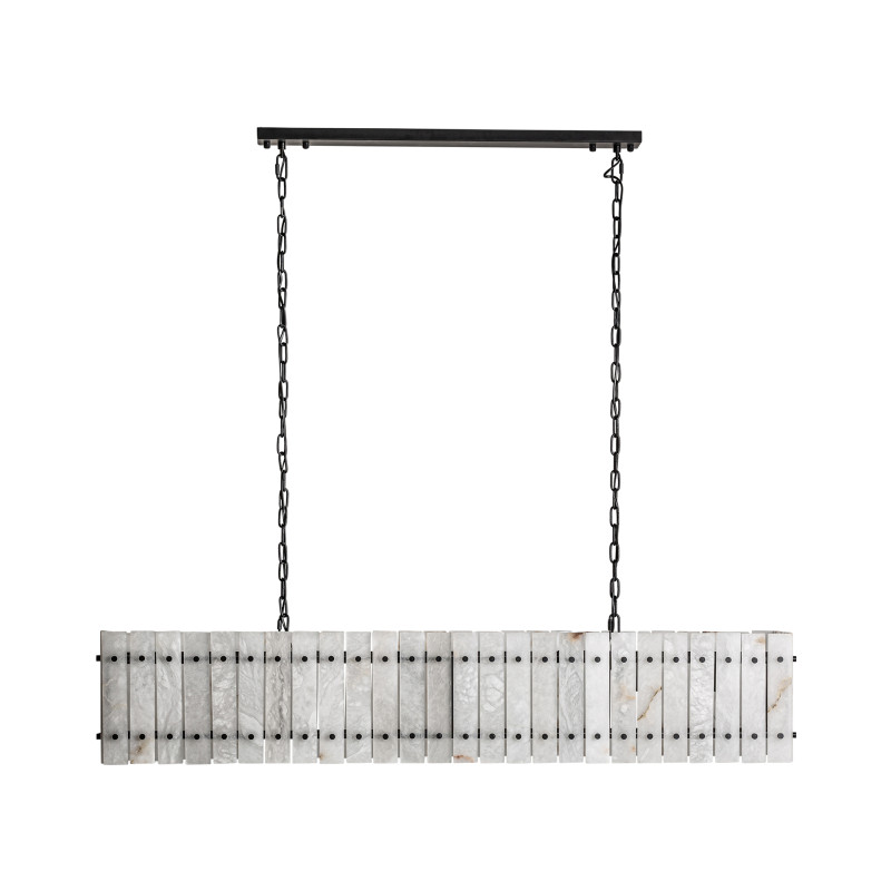 Lampara de colgar de estilo art deco fabricado en marmol en color blanco combinado con hierro en color negro. Producto desmontable.