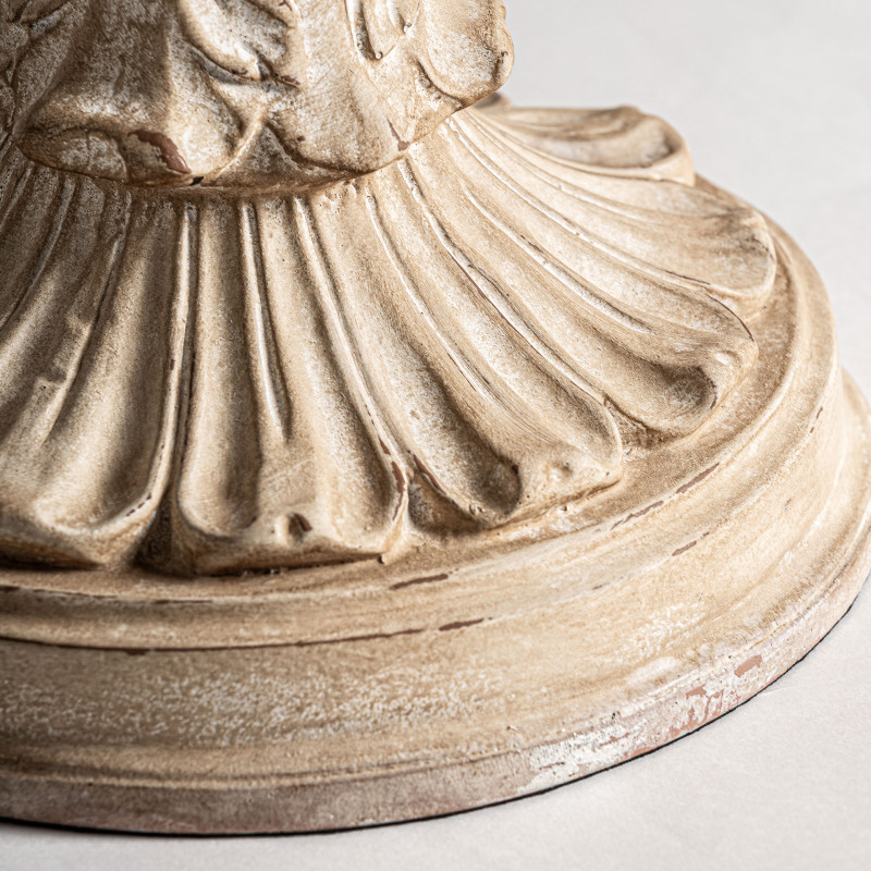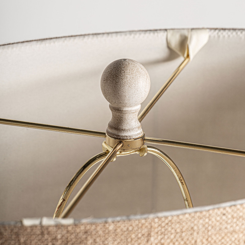 Lampara de pie de estilo provenzal fabricado en resina en color beige con acabado envejecido combinado con algodon. Producto desmontable.