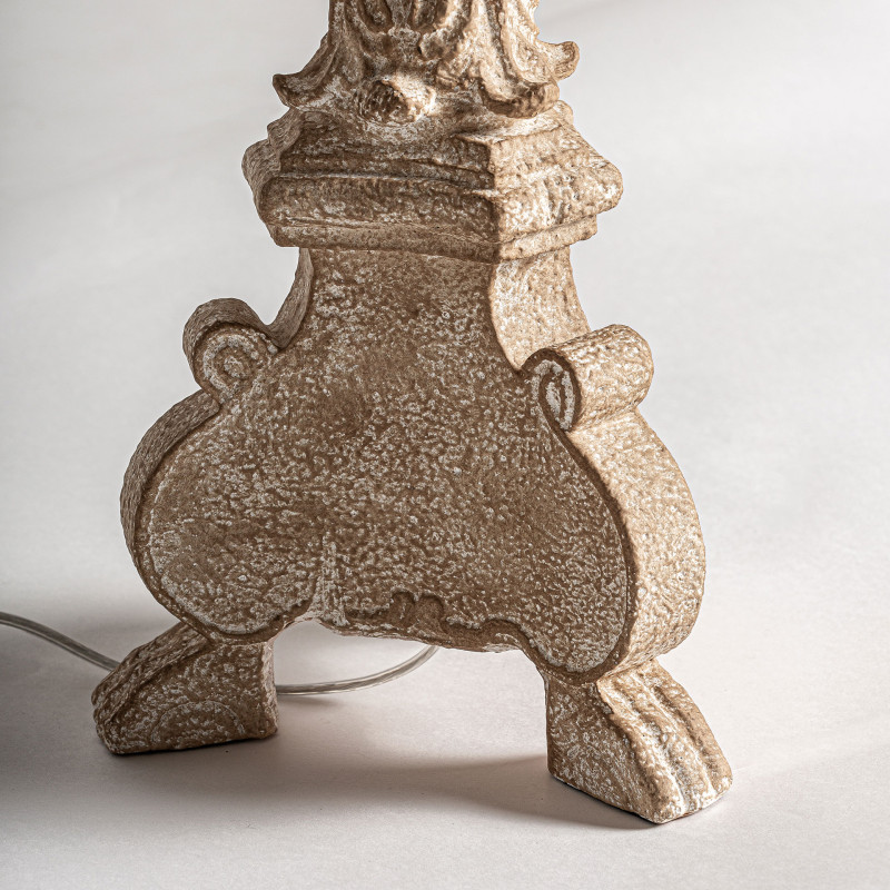 Lampara de sobremesa de estilo provenzal fabricado en resina en color marron combinado con algodon en color beige. Producto desmontable.