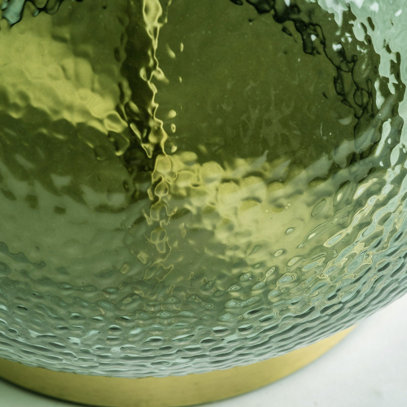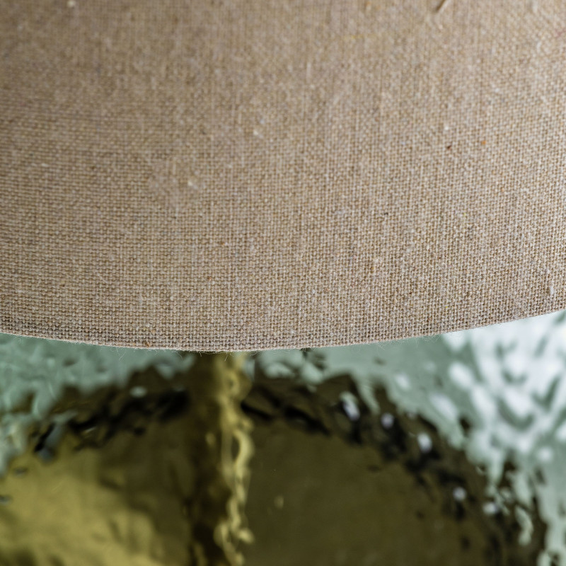 Lampara de sobremesa de estilo clasico fabricado en hierro en color verde combinado con vidrio en color oro y lino. Producto desmontable.