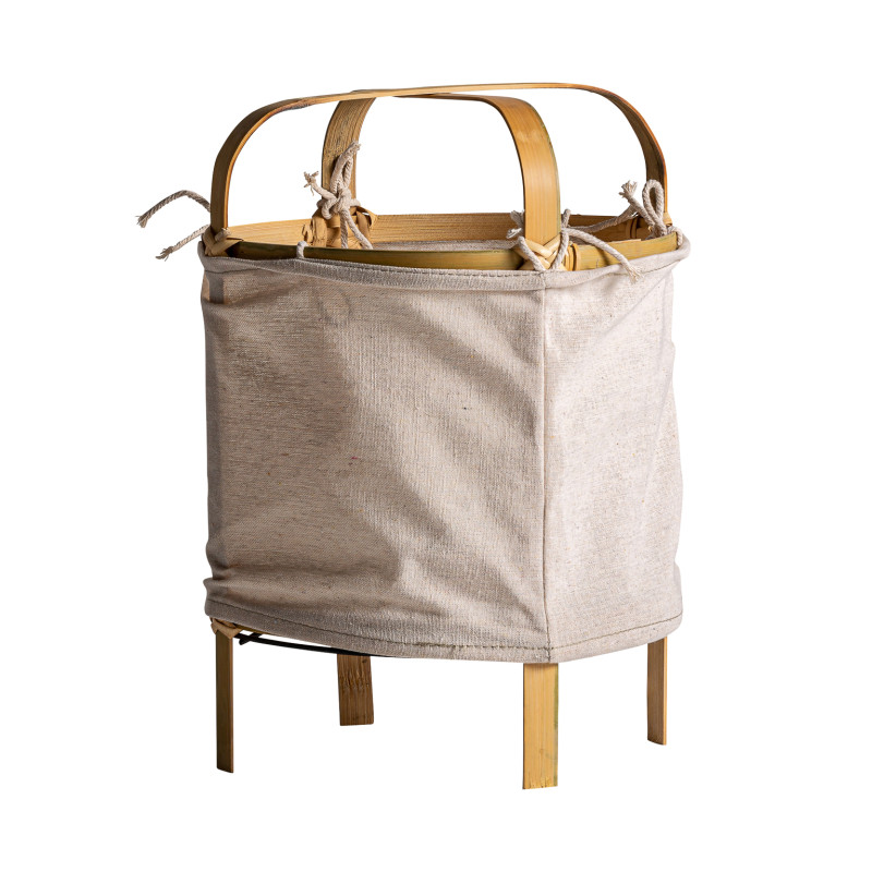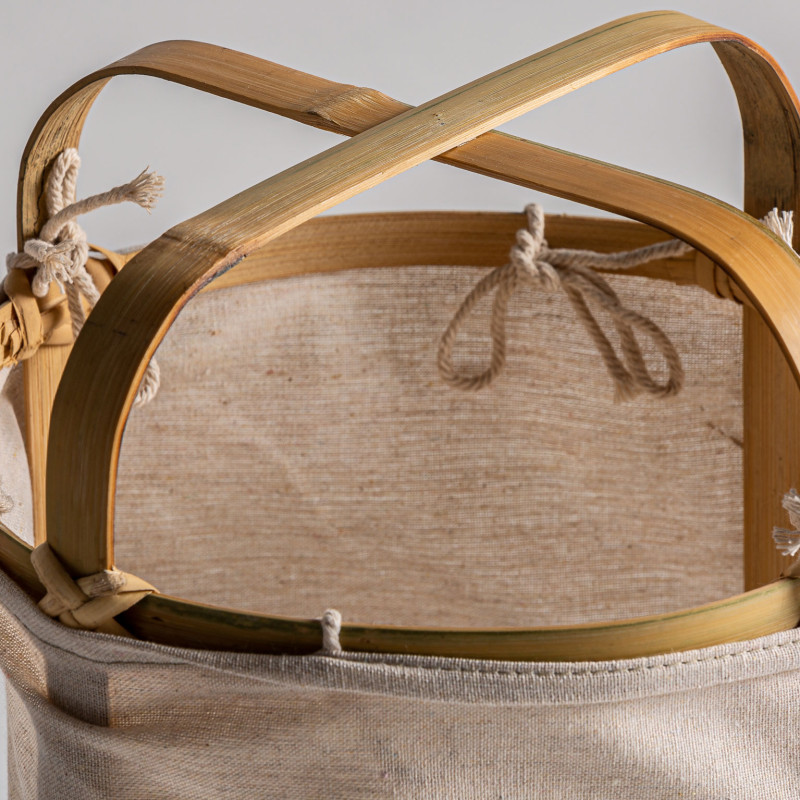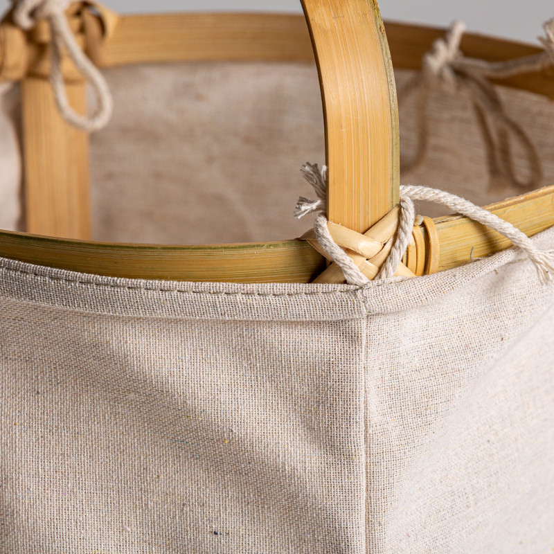 Lampara de sobremesa de estilo contemporaneo fabricado en bambu en color marron combinado con lino y hierro.