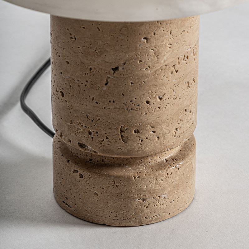 Lampara de sobremesa de estilo art deco fabricado en ceramica en color blanco combinado con marmol en color beige y bronce. Producto desmontable.