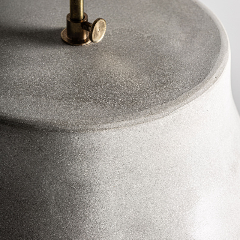 Lampara de sobremesa de estilo contemporaneo fabricado en cemento en color blanco con acabado decapado combinado con yute en color marron.