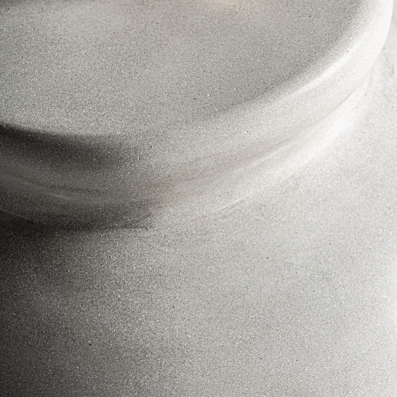 Lampara de sobremesa de estilo contemporaneo fabricado en cemento en color blanco con acabado decapado combinado con algodon en color marron. Producto desmontable elevable.