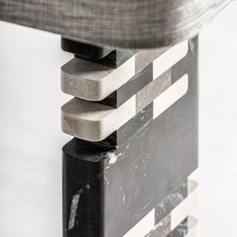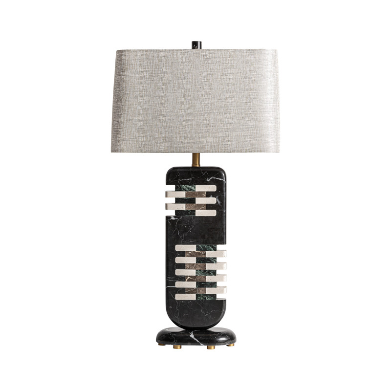 Lampara de sobremesa fabricado en marmol en color negro combinado con metal en color dorado y poliester en color arena con acabado jaspeado.