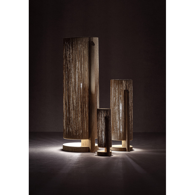 Lampara de Sobremesa Jacquard de estilo Contemporaneo. Fabricado en Madera de Mango en Color Marron Combinado Con Rafia en Color Marron Claro.