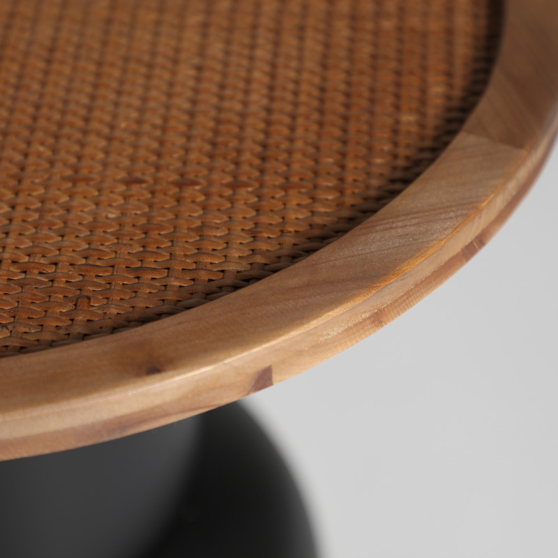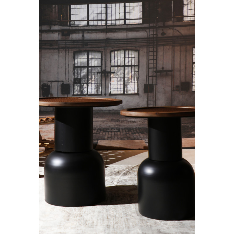 Mesa auxiliar meysse, en color negro/natural, de estilo industrial. Fabricado en madera de abeto, combinado con hierro y ratan. Producto desmontable.