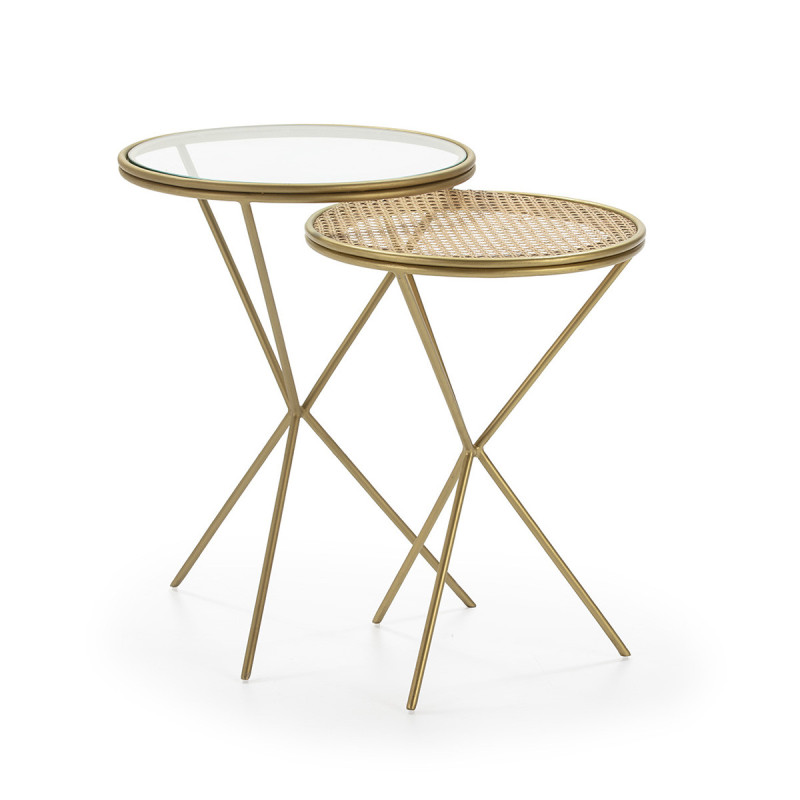 MESA AUXILIAR SET/2 49x49x67/45x45x61 CRISTAL/RATAN/METAL DORADO