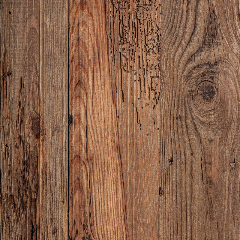 Mesa auxiliar breive de estilo rustico fabricado en madera de pino reciclado en color marron con acabado envejecido.