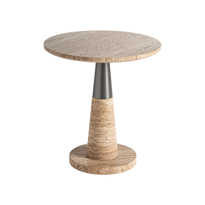 Mesa auxiliar Rust de estilo art deco fabricado en marmol en color beige combinado con hierro en color oro con acabado bronce.
