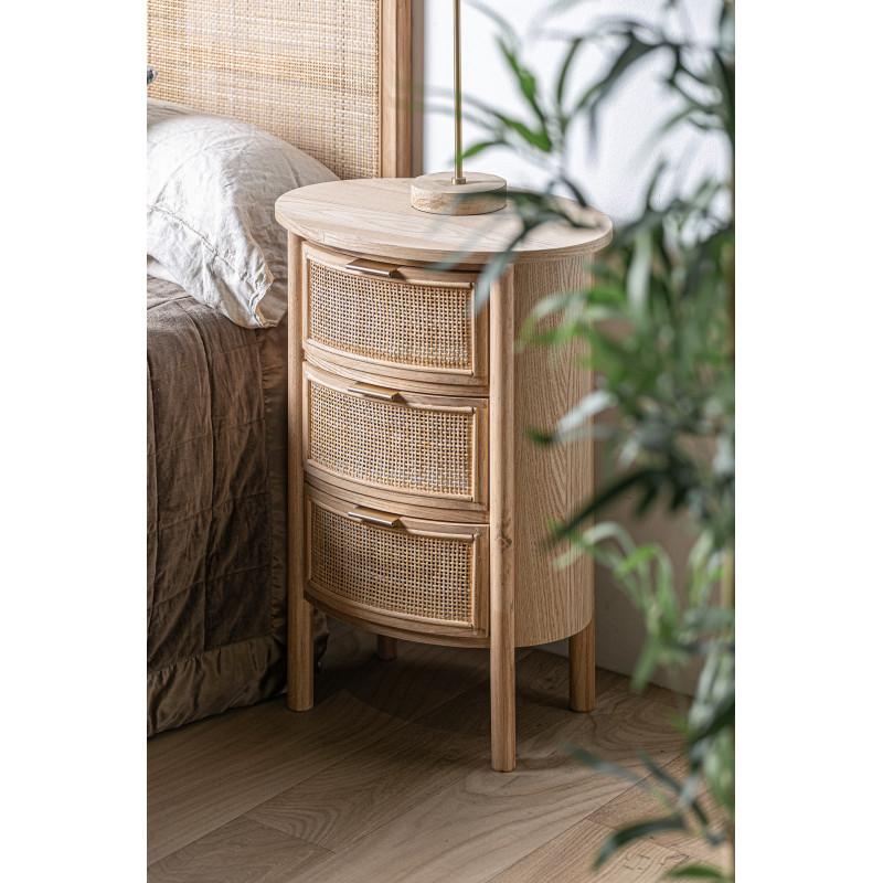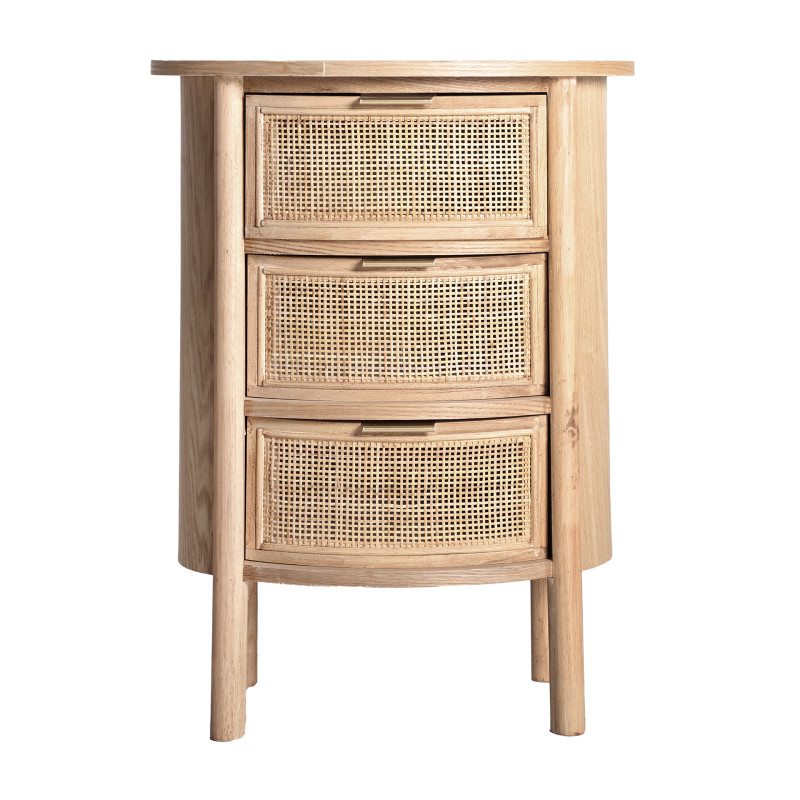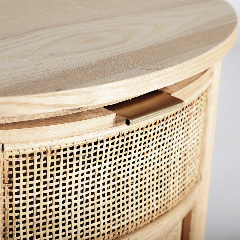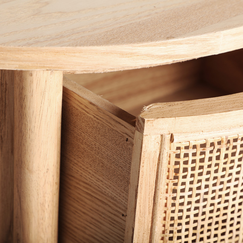 Mesita ikla, en color natural, de estilo nordico. Fabricado en madera dm, combinado con madera de fresno y ratan.