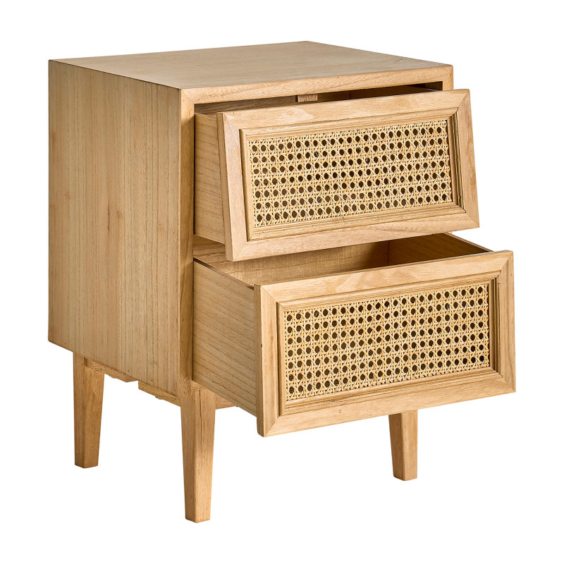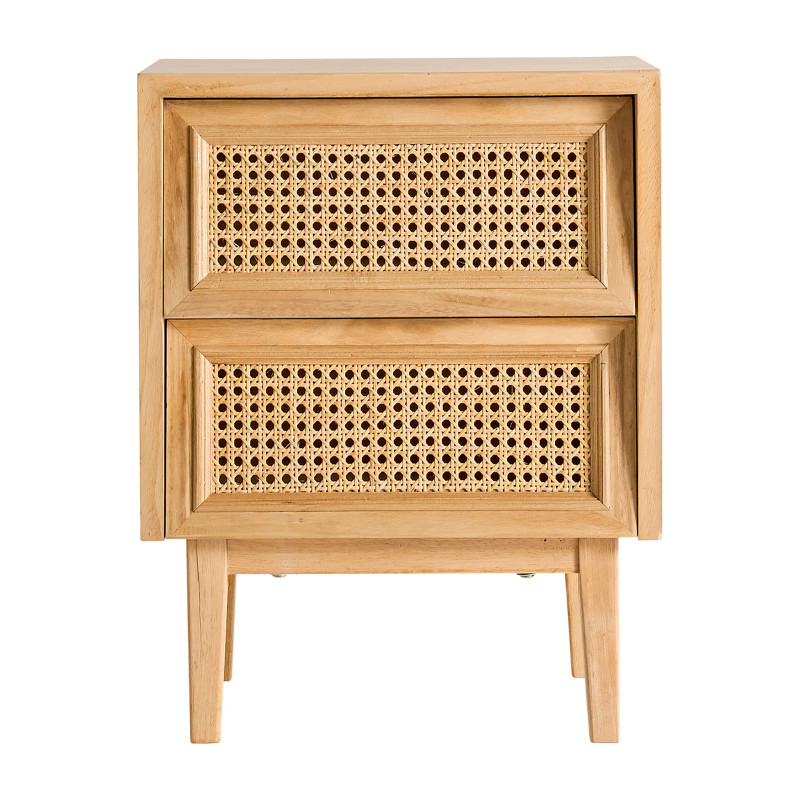 Mesita kavos, en color natural, de estilo nordico. Fabricado en madera de pino, combinado con madera dm y ratan. Producto desmontable.