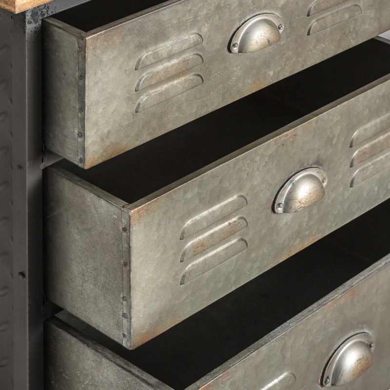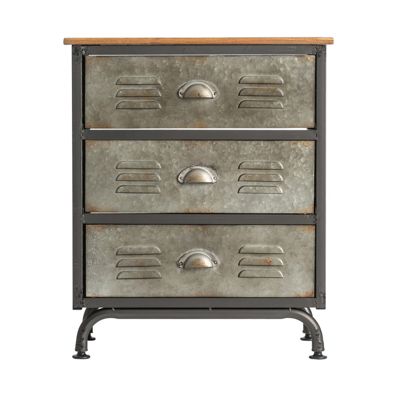 Mesita rectangular ostrava, en color gris oxidado, de estilo industrial. Fabricado en hierro, combinado con madera de abeto.