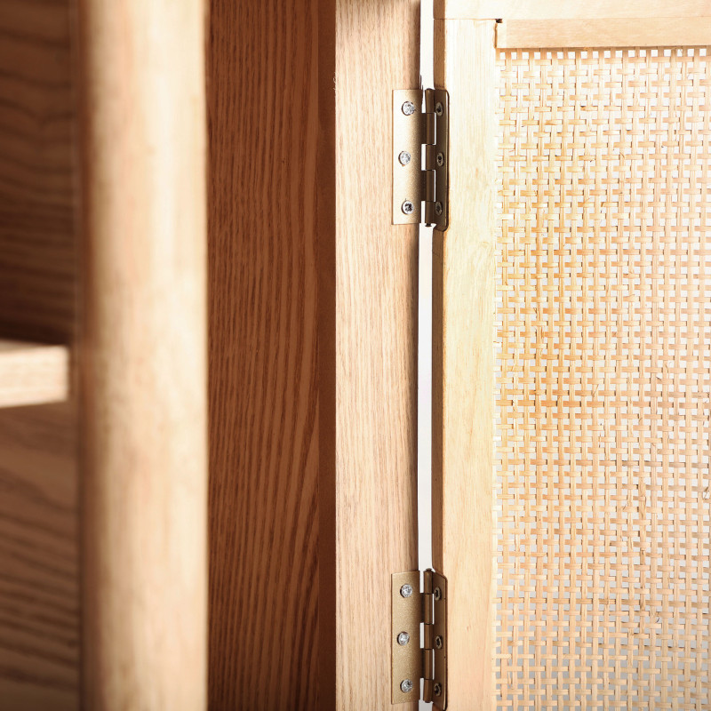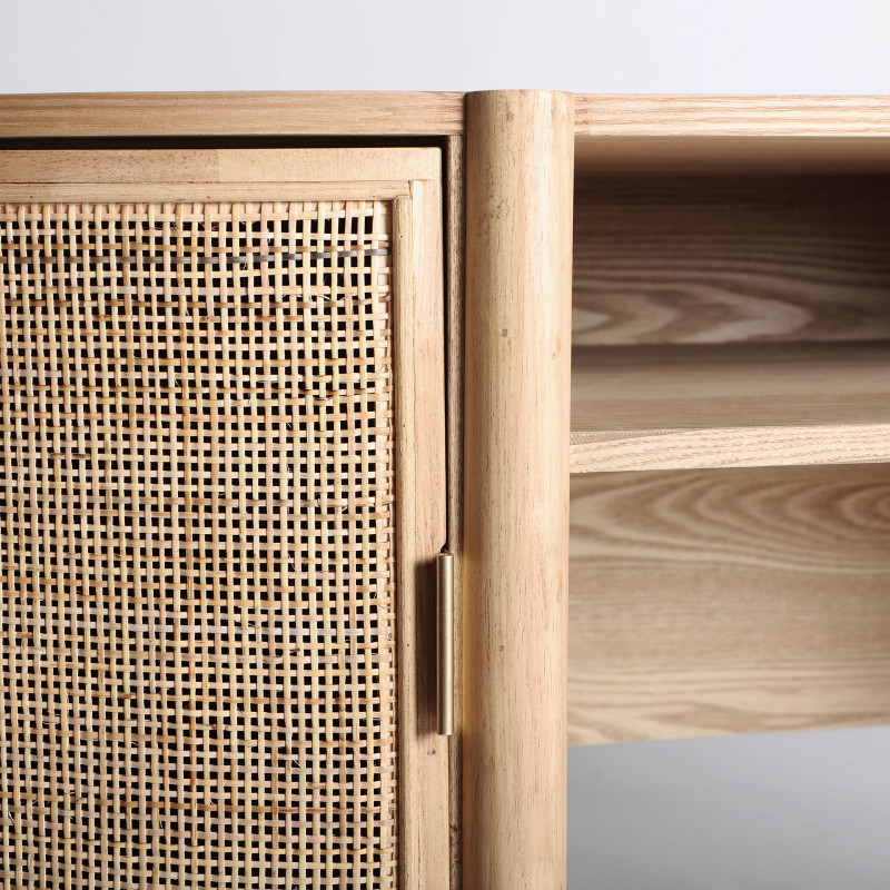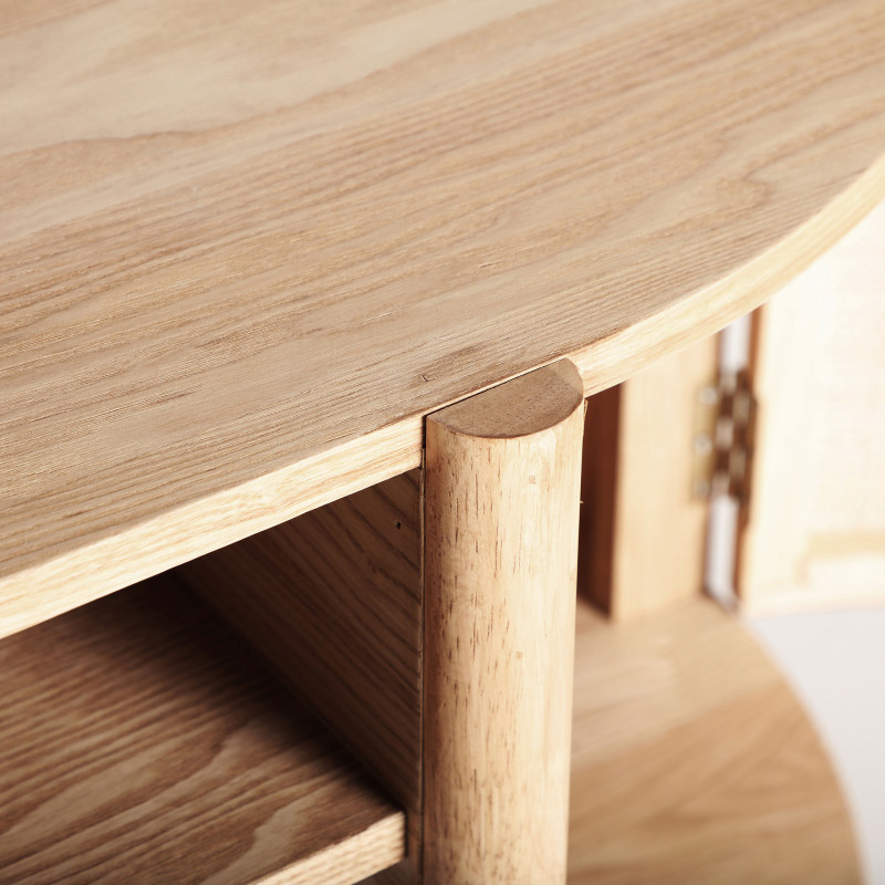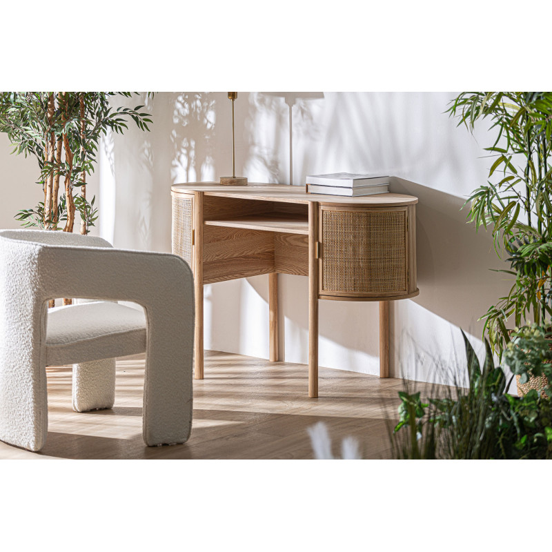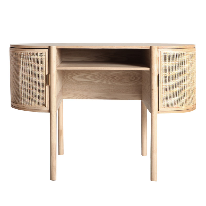 Escritorio oval ikla, en color marron, de estilo nordico. Fabricado en madera dm, combinado con madera de fresno y ratan.