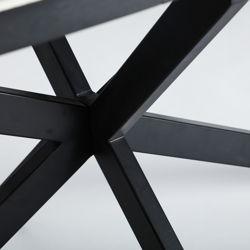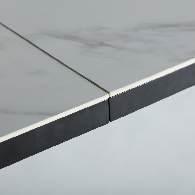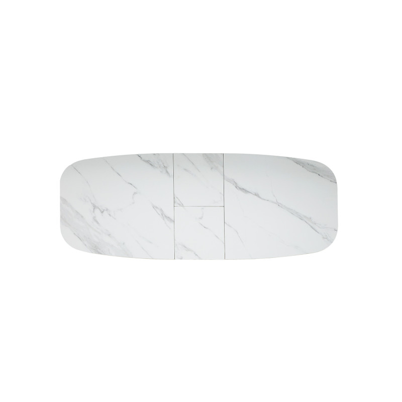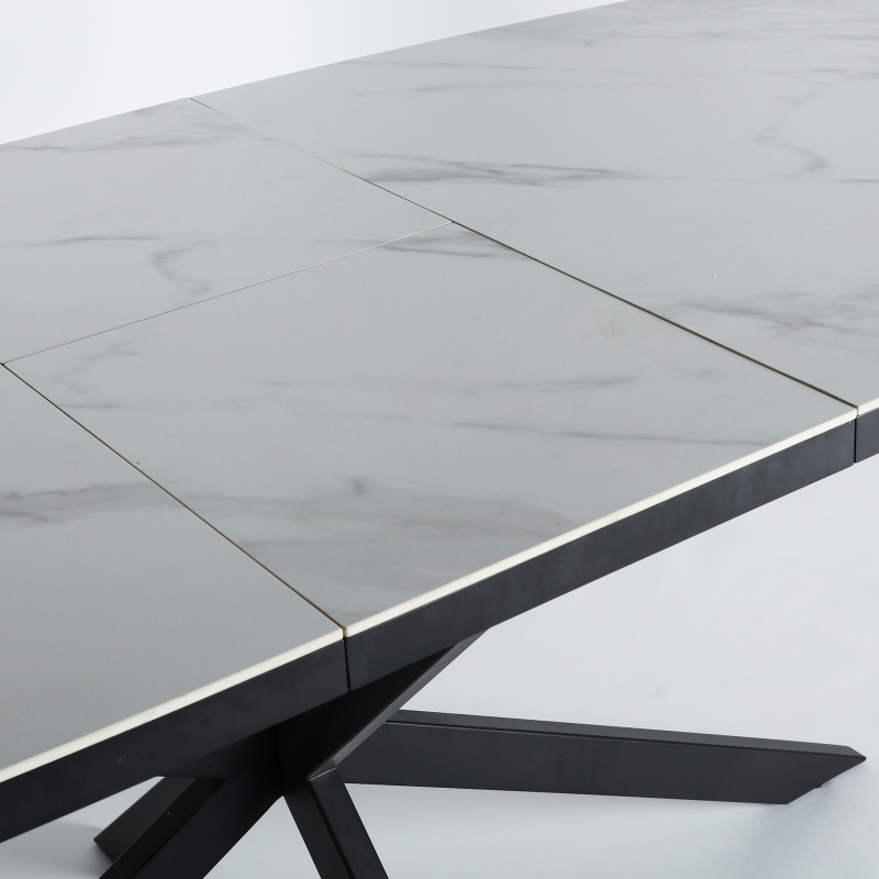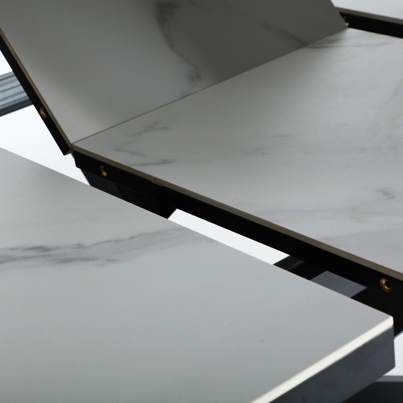 Mesa extensible Droux de estilo contemporaneo, fabricado en madera dm en color negro, combinado con ceramica en color blanco y hierro en color negro.