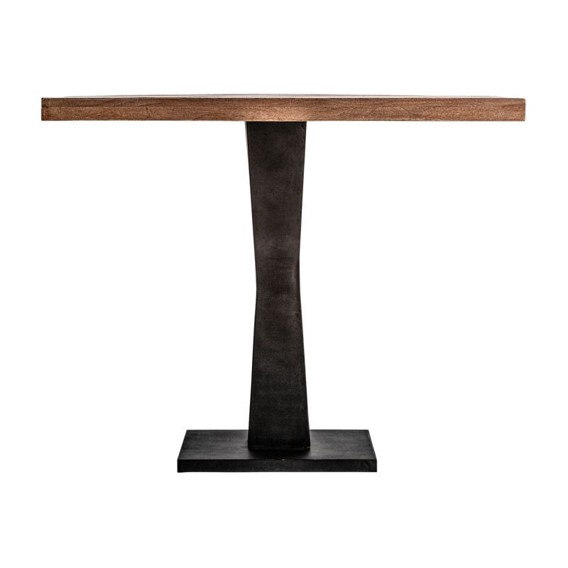 Mesa bar bugle de estilo industrial fabricado en madera de mango en color marron combinado con hierro en color negro. Producto desmontable.