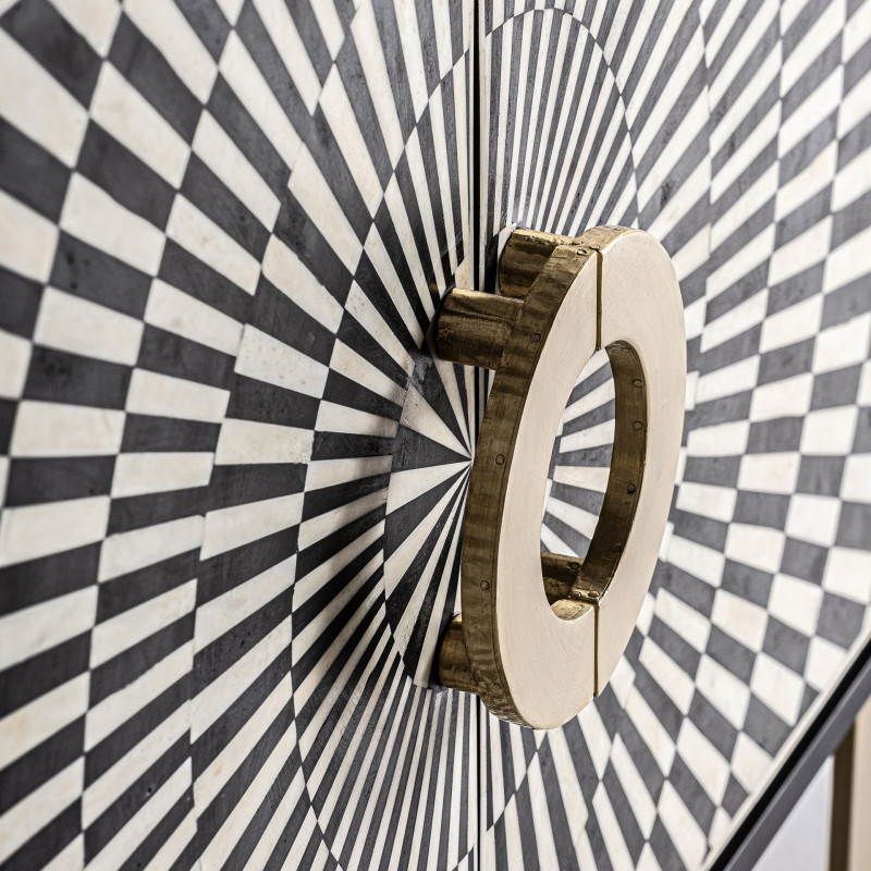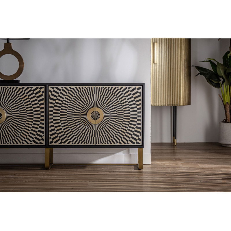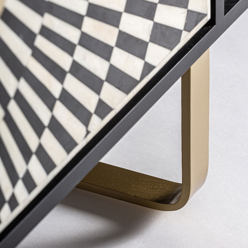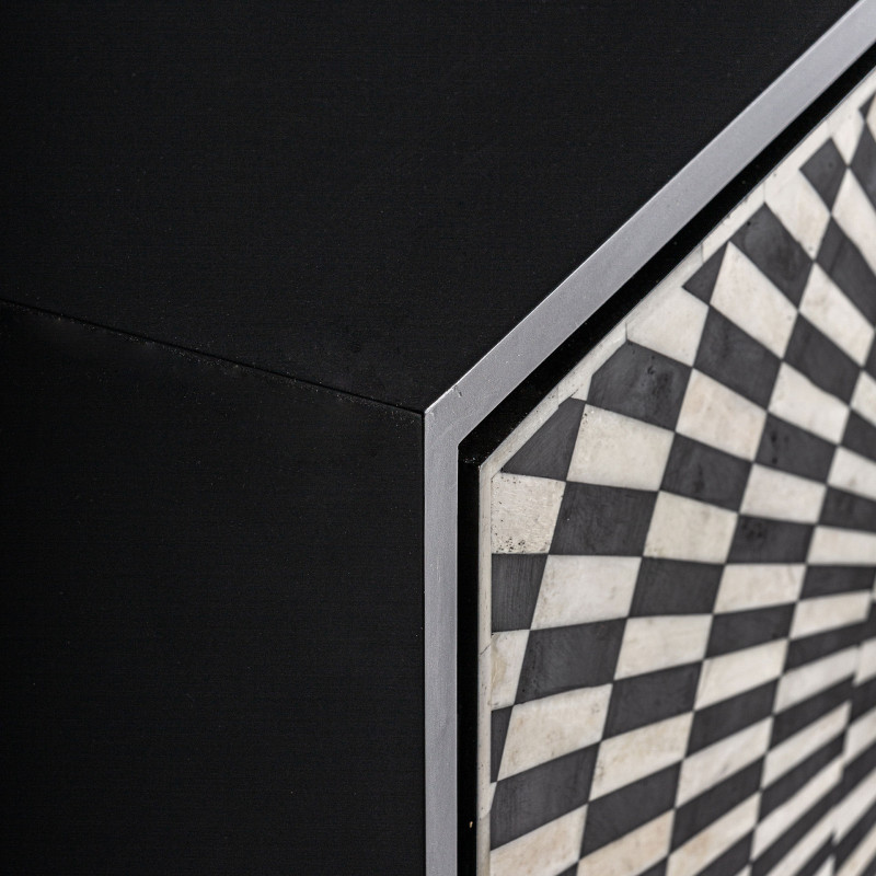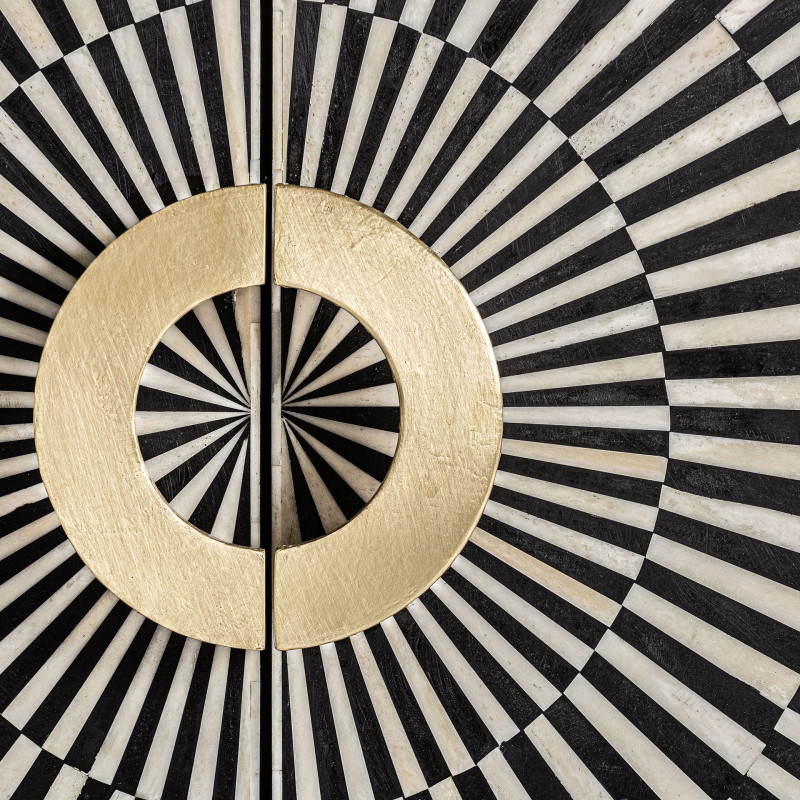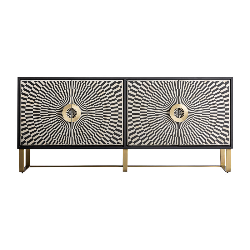 MUEBLE TV, EN COLOR NEGRO/BLANCO/ORO. FABRICADO EN HIERRO, COMBINADO CON HUESO.