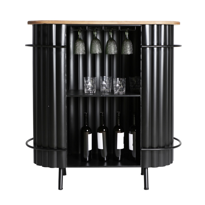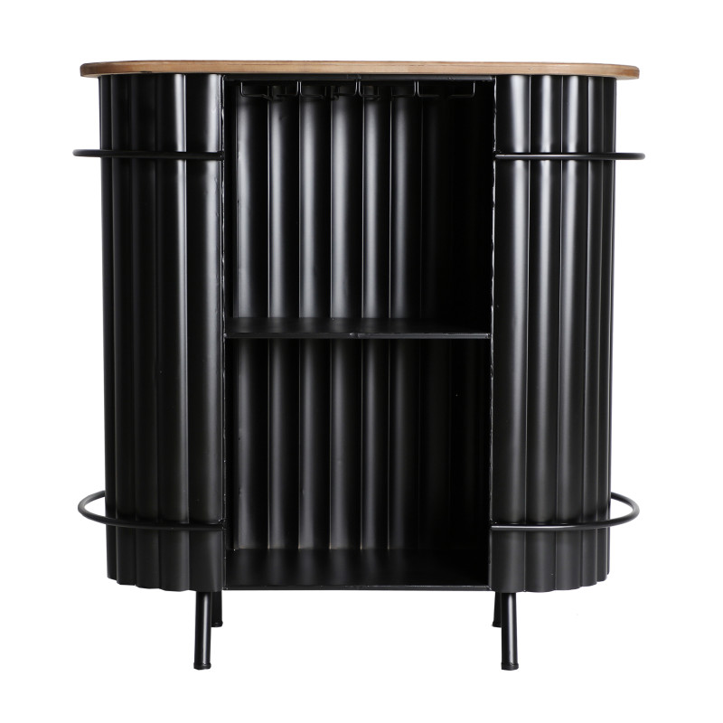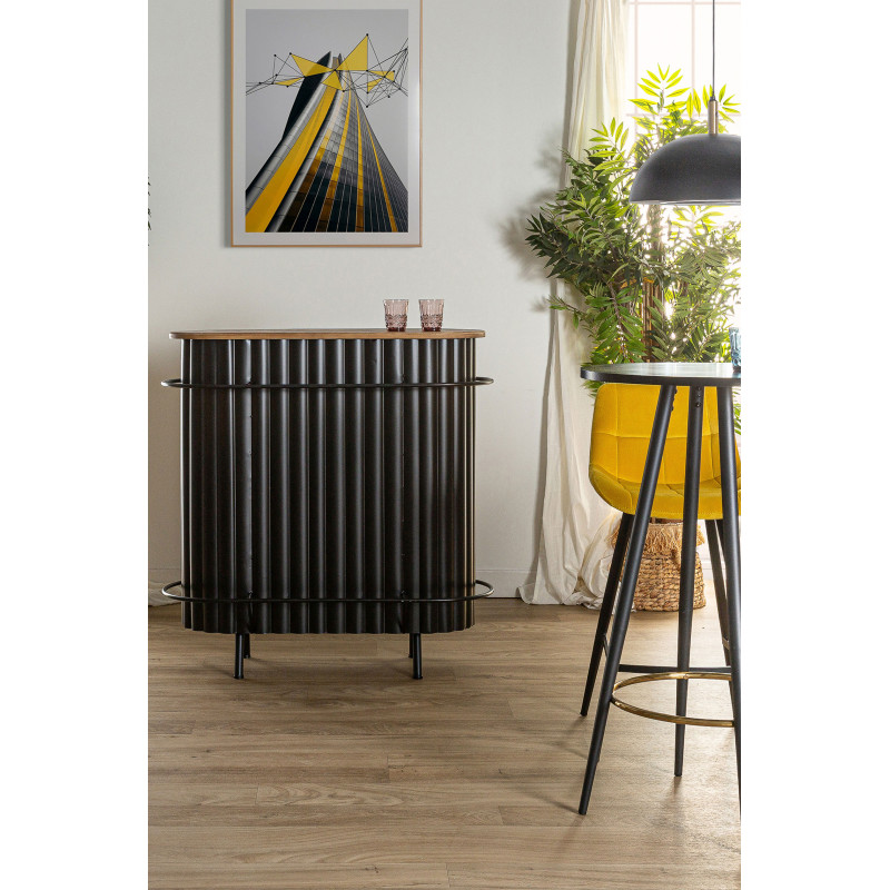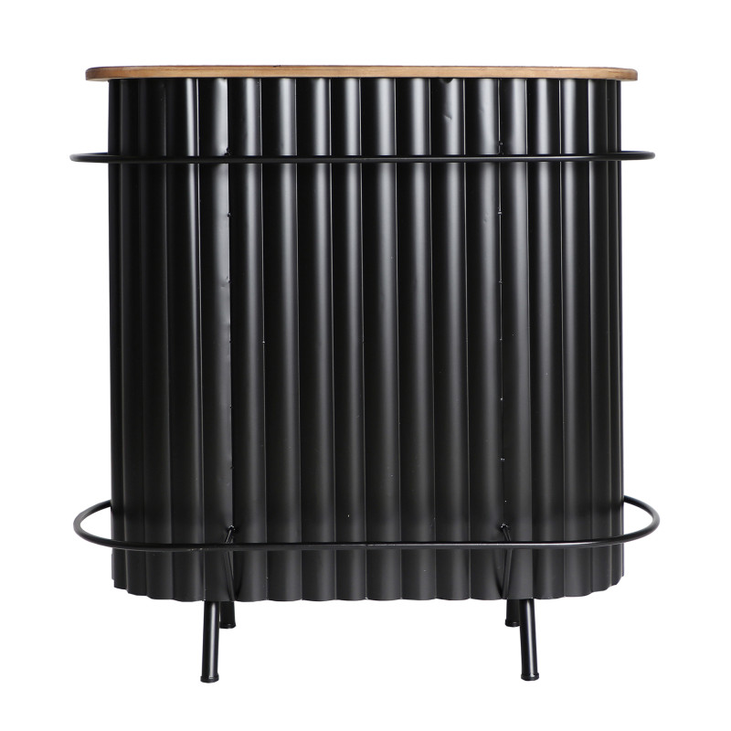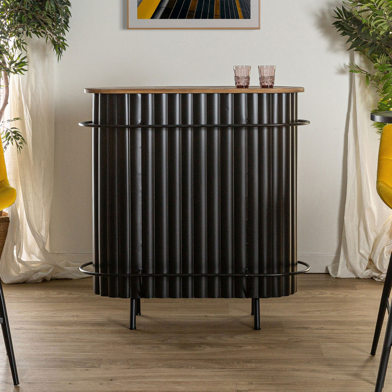 Barra de bar rectangular meysse, en color negro, de estilo industrial. Fabricado en madera roble, combinado con hierro. Producto desmontable.