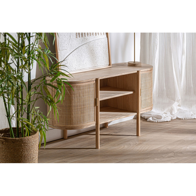 Mueble tv oval ikla, en color marron, de estilo nordico. Fabricado en madera dm, combinado con madera de fresno y ratan.
