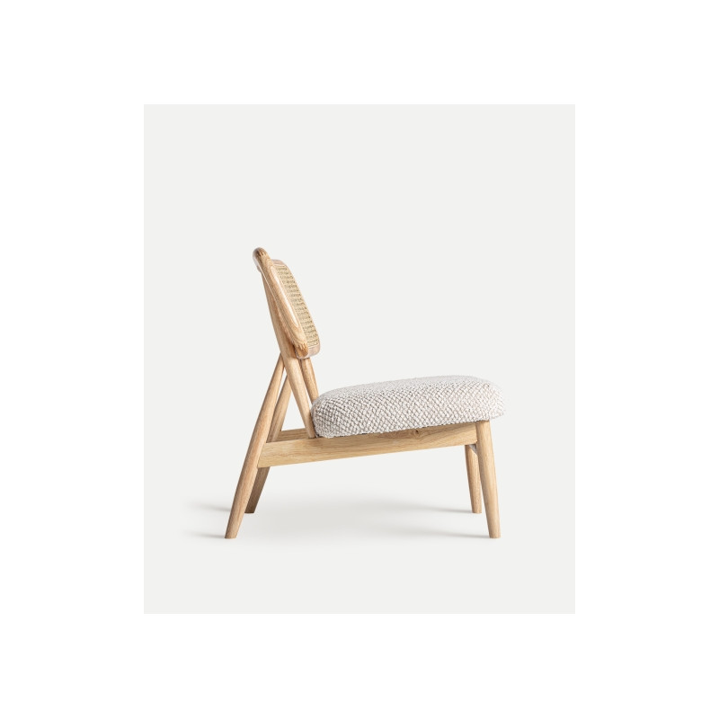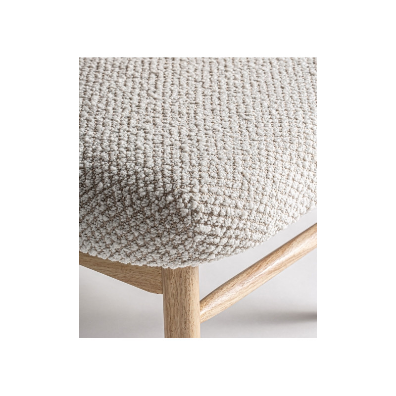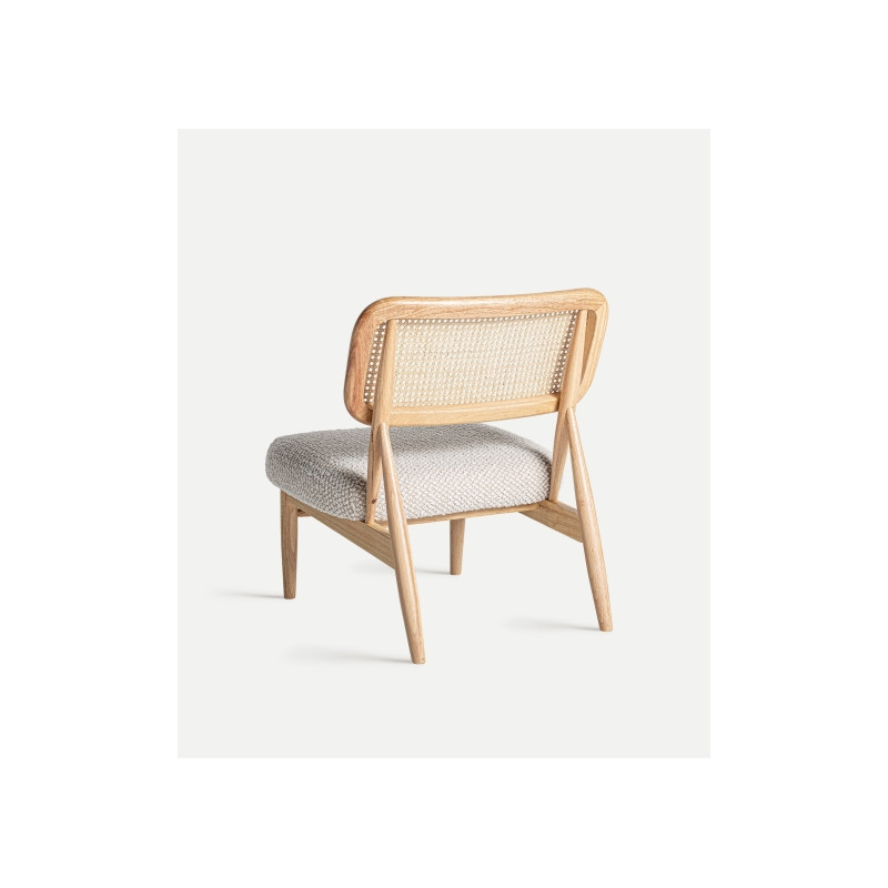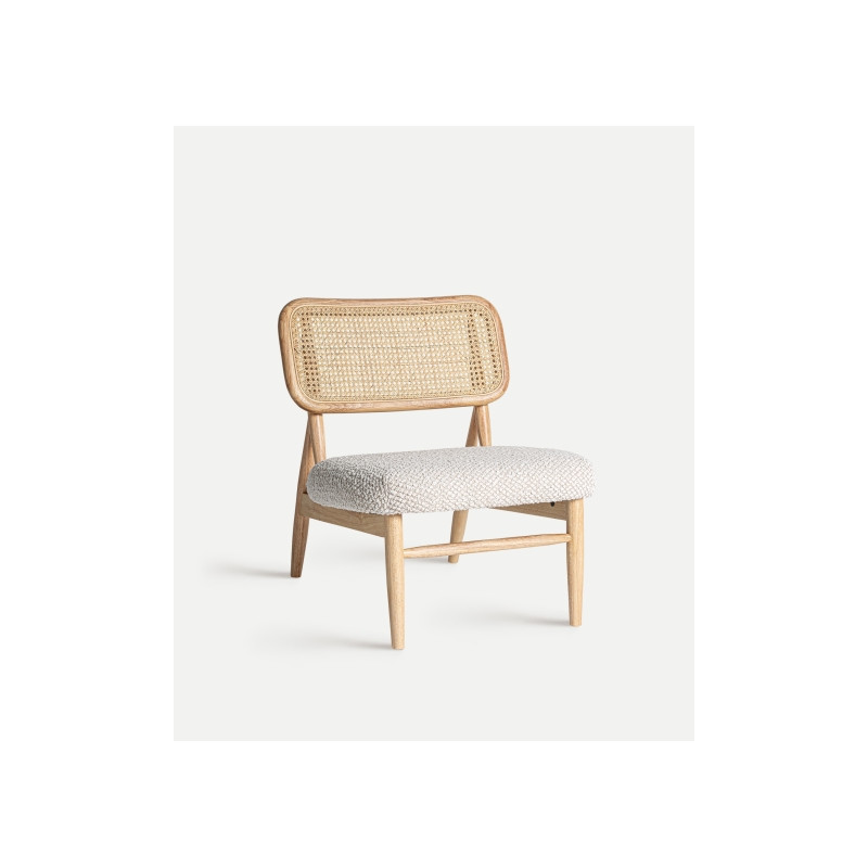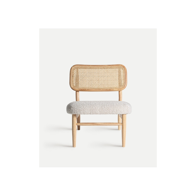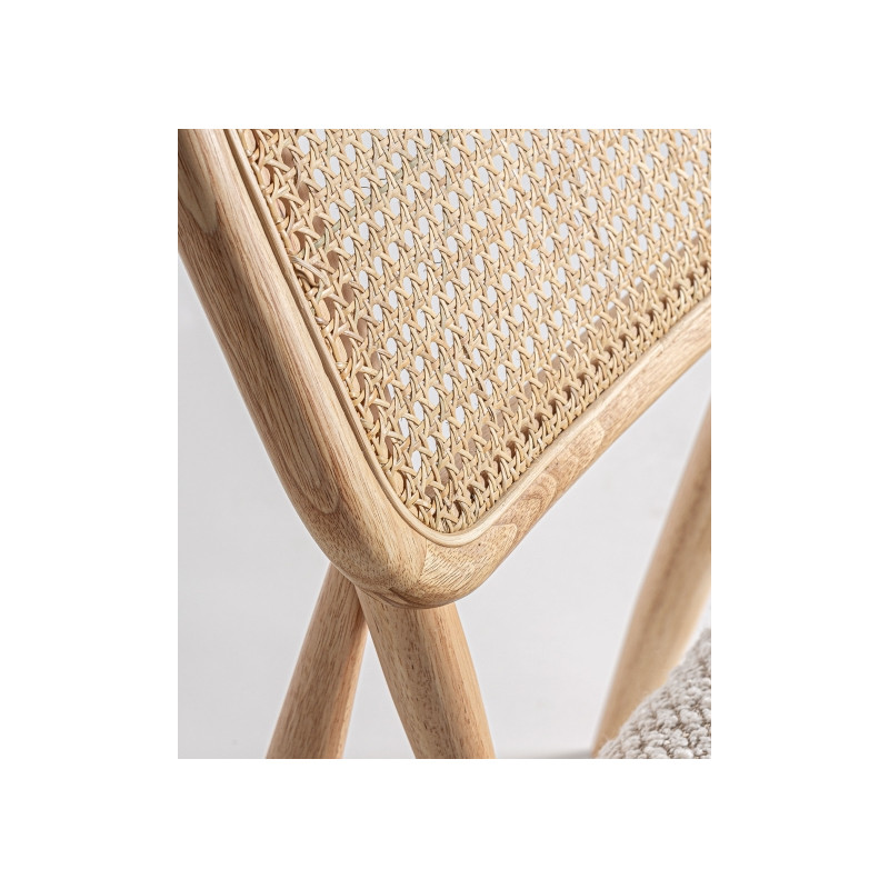 Silla rectangular glassue de estilo boho, fabricado en ratan en color marron, combinado con madera de caucho en color blanco roto y poliester.