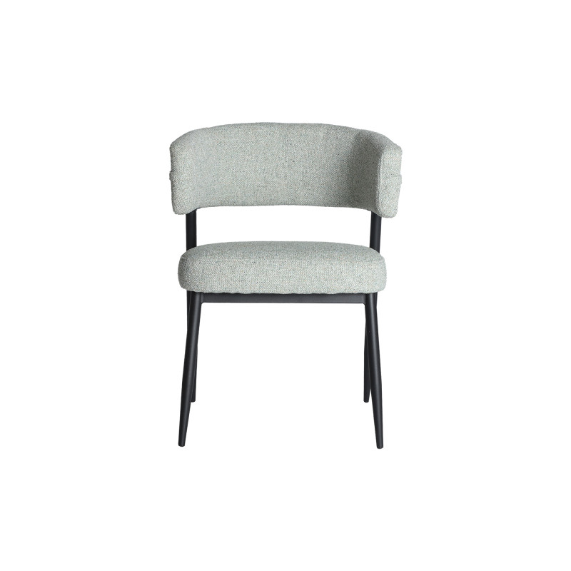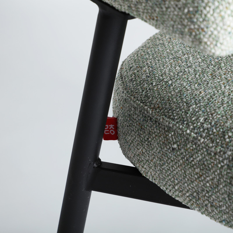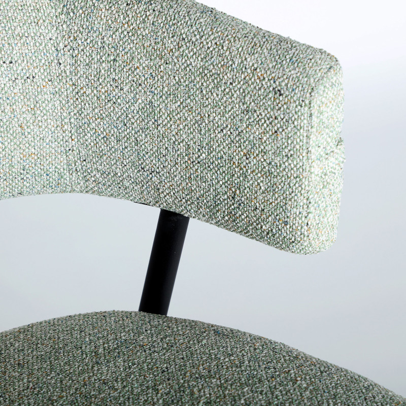 Silla Merano de estilo minimalista, fabricado en poliester en color verde con acabado jaspeado, combinado con hierro en color negro con acabado mate.